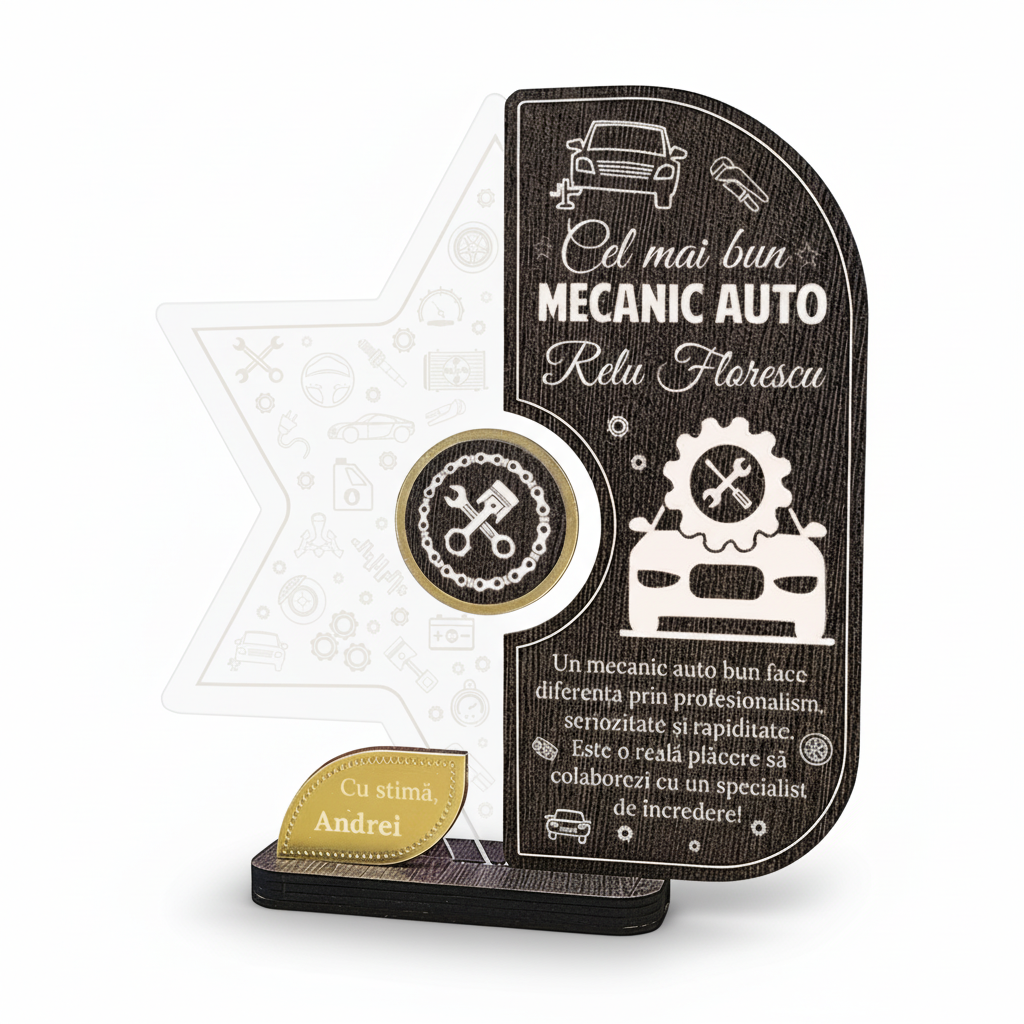 Acest trofeu este meticulos realizat din PFL wenge și plexiglas, două materiale apreciate pentru durabilitate și finisaj elegant. Dimensiunile sale sunt de 22×20 cm, ceea ce îl face suficient de marcant, dar și adecvat pentru a fi expus într-un spațiu profesional. Perfect pentru a aduce un plus de stil, acest cadou va fi cu siguranță apreciat, aspect evidențiat și în recenziile pozitive ale clienților noștri.