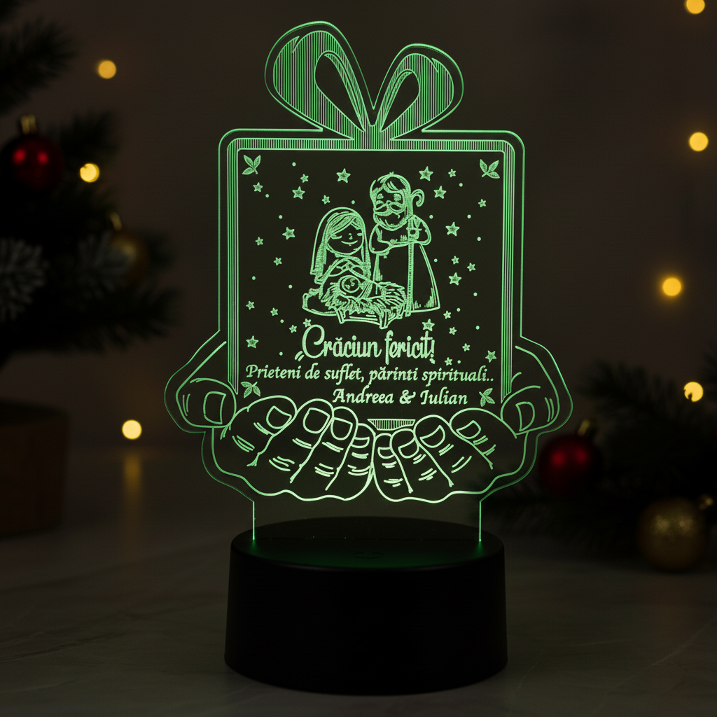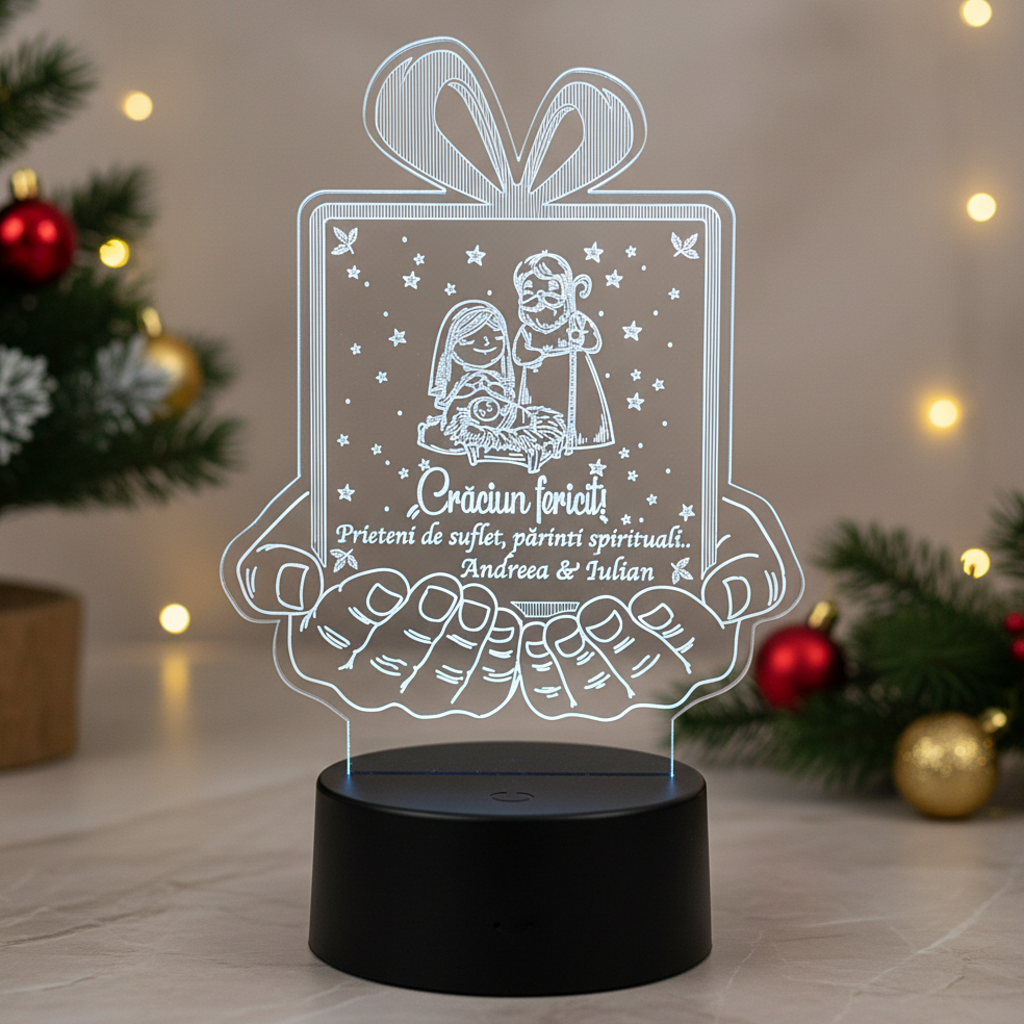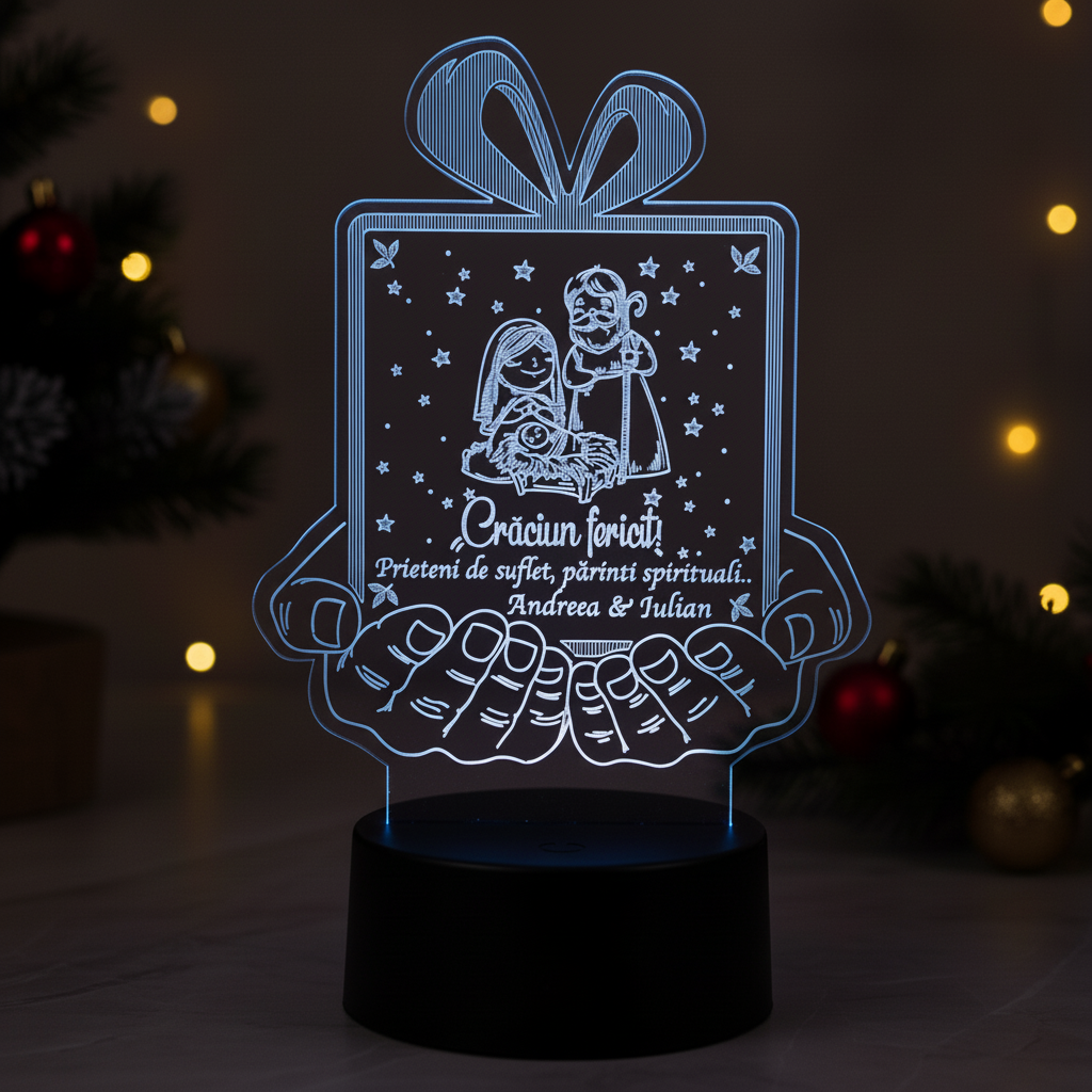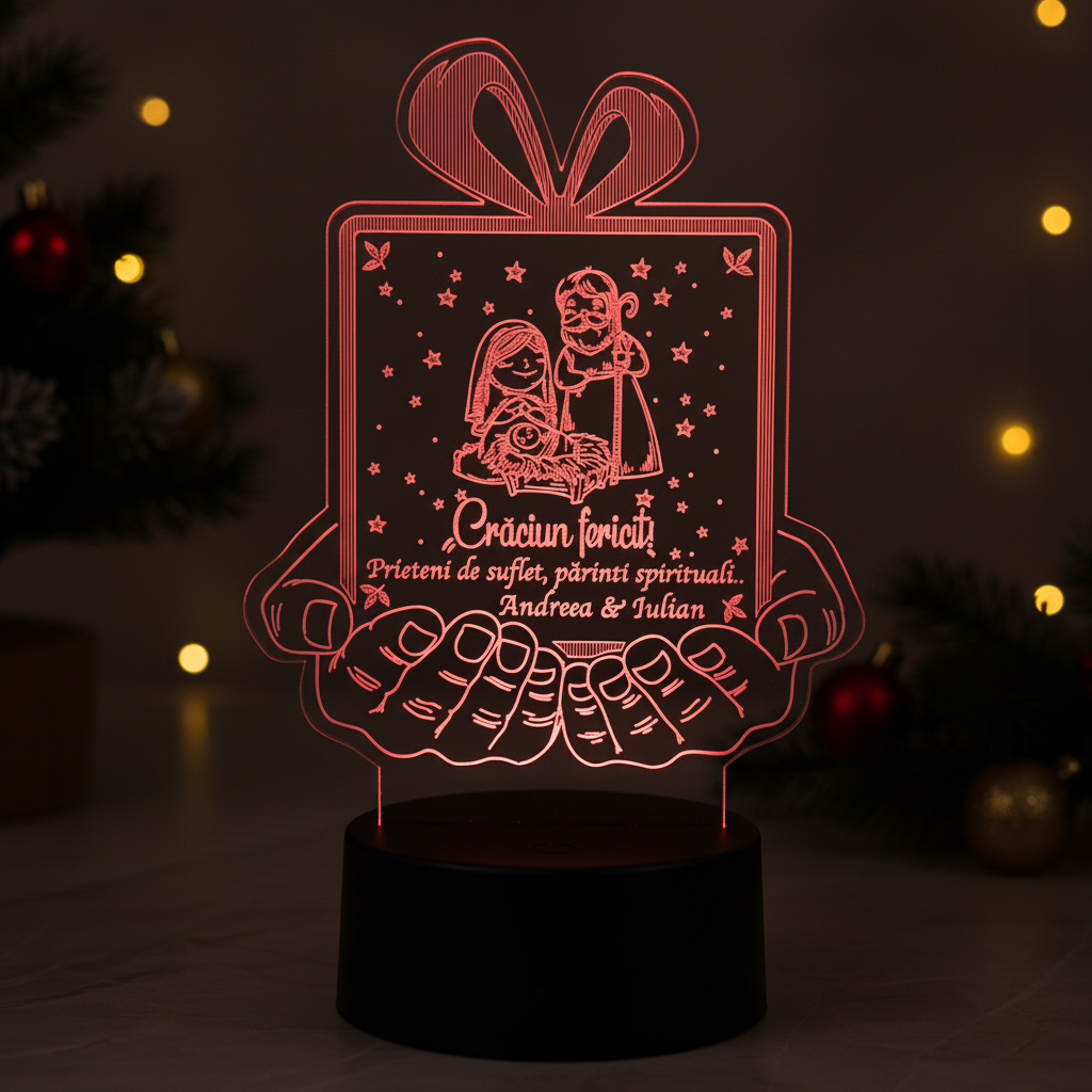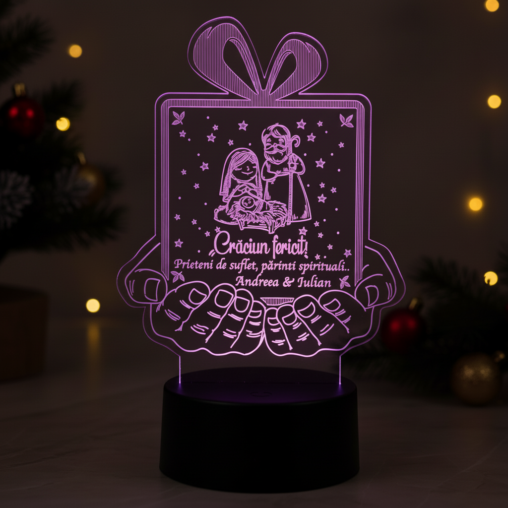 Surprindeți-i pe nașii de botez și pe nașii de cununie cu această lampa LED din plexiglas, măsurând 21.5×14.5cm, ce aduce un strop de magie oricărei încăperi. Designul său modern, împreună cu lumina LED multicoloră, aduce o atmosferă festivă prin nuanțele de roșu, albastru și mov. Această lampa decorativă poate fi personalizată cu un mesaj special, reflectând aprecierea voastră sinceră pentru tot ceea ce au făcut pentru voi. De-a lungul timpului, am primit numeroase recenzii pozitive, ceea ce demonstrează că acest cadou este cu adevărat iubit de cei care l-au dăruit.