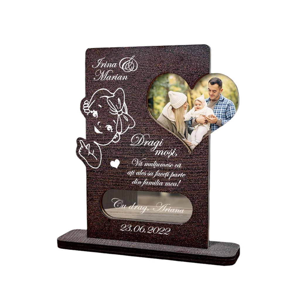 Acest trofeu personalizat, cu dimensiunile de 19×13 cm, este realizat din materiale ecologice precum pfl wenge și plexiglas, care evocă naturalețea și durabilitatea. Inima simbolizată în acest cadou reflectă legătura strânsă dintre cei dragi și micuța ta. Oferind un mesaj personalizat și o fotografie special aleasă, acest cadou devine o amintire emoționantă și un suvenir de neuitat pentru nași și mosi. Recenziile clienților evidențiază aprecierea sinceră pe care o aduce acest cadou în momentele speciale ale vieții. Astfel, trofeul devine nu doar un obiect, ci un simbol al iubirii și al legăturilor interumane.