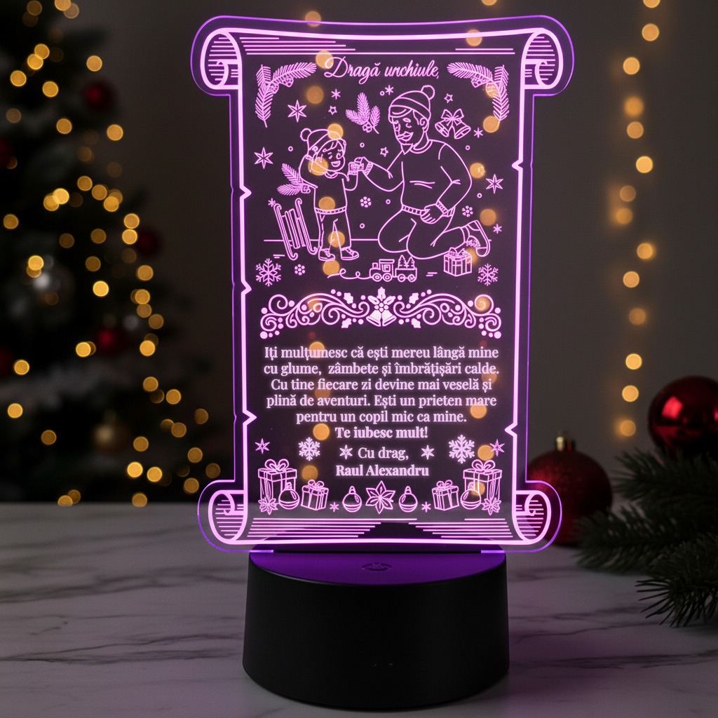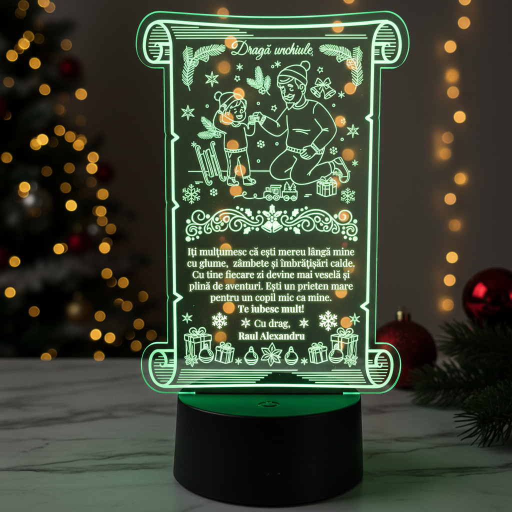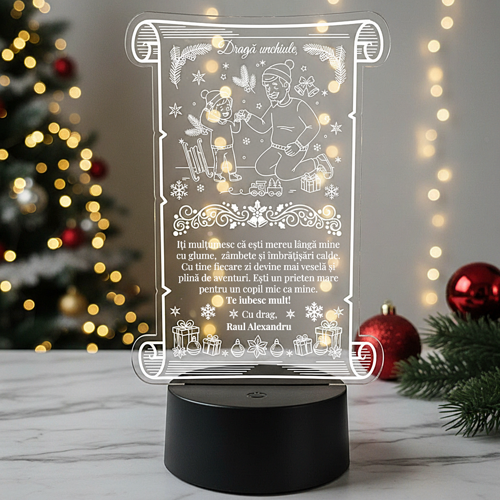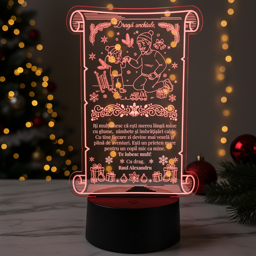 Realizat din plexiglas de calitate, trofeul LED cu dedicaţie pentru unchi reuşeşte să îmbine eleganţa cu funcţionalitatea, transformând orice mesaj într-o experienţă luminoasă şi specială. Dimensiunea generoasă de 21×14 cm permite gravarea unui text personalizat care va fi pus în valoare de iluminarea caldă a LED-ului, aducând un plus de originalitate fiecărei seri de Crăciun. Acest suvenir luminoasă a fost deja ales de numeroşi cumpărători aflaţi în căutarea unui cadou personalizat de Crăciun pentru unchi, fiind apreciat pentru efectul său decorativ şi emoţional.