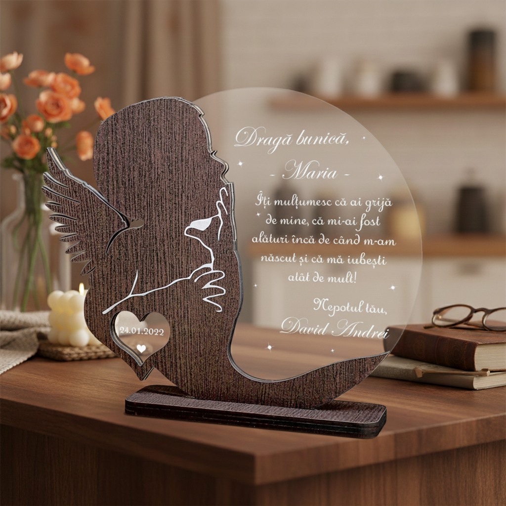 Dimensiunile de 18×23.5 cm ale acestui trofeu îl fac un cadou perfect pentru a fi expus în casa bunicii tale. Creat din materiale de calitate, acest trofeu personalizat evocă sentimente profunde și îi reamintește de momentele frumoase petrecute împreună. Mesajul inclus pe trofeu are puterea de a aduce zâmbete și emoții sincere, transformându-l într-un cadou memorabil. Foarte apreciat de numeroase persoane care l-au ales ca dar special, acest cadou va aduce cu siguranță un strop de bucurie în viața bunicii tale. Alege-l cu încredere și îți vei exprima gratitudinea și dragostea într-un mod unic.