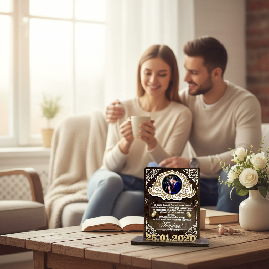 Trofeul personalizat, cu dimensiunile sale de 17.5x18cm, este realizat din materiale de calitate superioară, precum pfl wenge și plexiglas, ce garantează durabilitatea și un aspect elegant. Acest cadou romantic reprezintă o alegere perfectă pentru a celebra momentele speciale din relația voastră. Oferindu-l, veți transmite sentimente profunde de apreciere și iubire, iar designul său unic va fi admirat cu siguranță. Apreciat de numeroși clienți care l-au achiziționat anterior, acest trofeu va adăuga o notă emoționantă și personală aniversării voastre.