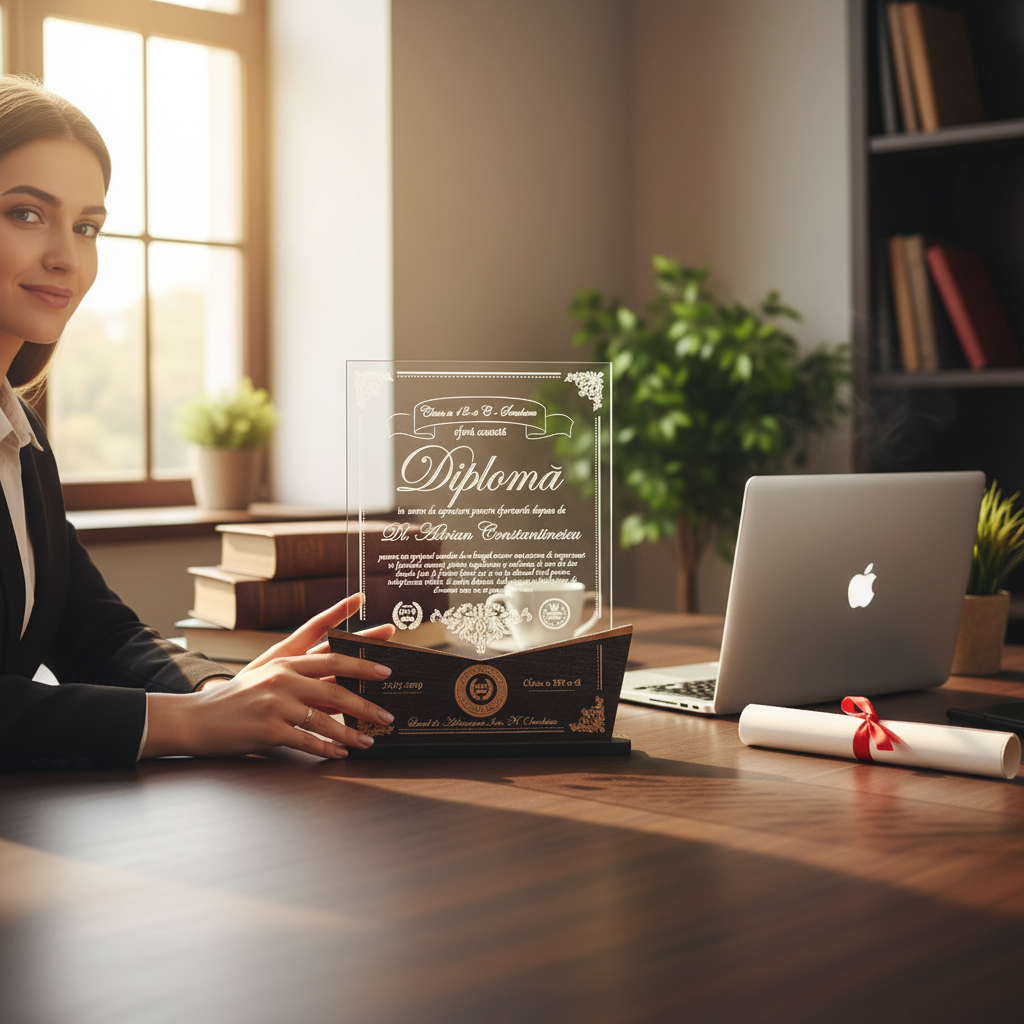 Diploma personalizata pentru profesori este realizata din plexiglass si lemn pfl. Aceste materiala ii ofera produsului o eleganta de nedescris, potrivita pentru un cadru didactic.