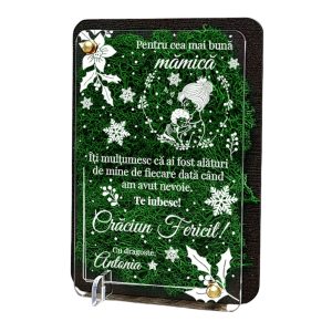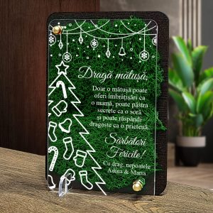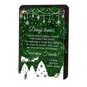 Realizată din plexiglas, licheni şi lemn wenge, felicitarea este un cadou ideal pentru orice persoană specială din viaţa ta. Plexiglasul este un material durabil şi rezistent, iar lichenii sunt cunoscuţi pentru longevitate şi ceea ce simbolizează: dragoste, înţelepciune şi durabilitate. Aceste două elemente se completează perfect între ele, oferind o felicitare unică şi memorabilă pe care tu o poţi personaliza cu un mesaj printat, astfel încât să fie şi mai specială.