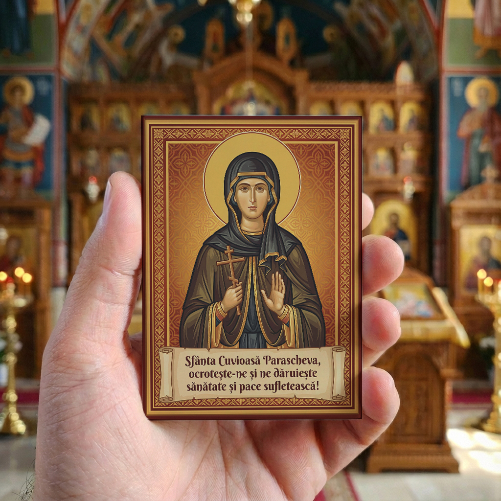 Sfânta Parascheva este cunoscută în tradiția populară românească ca vindecătoare a bolilor și ca ajutătoare în toate necazurile vieții. Credincioșii care s-au rugat ei cu credință au mărturisit despre vindecări miraculoase, despre protecție în timpul războaielor și epidemiilor, despre ajutor în probleme de familie și despre pace sufletească primită prin mijlocirea ei. Ea este văzută ca o sfântă apropiată care înțelege suferințele oamenilor simpli și care intervine cu blândețe maternă pentru a aduce alinare și speranță. Viața ei de pustnic nu a îndepărtat-o de nevoile concrete ale oamenilor, ci dimpotrivă, rugăciunea ei stăruitoare a făcut-o să fie un canal puternic al harului dumnezeiesc pentru toți cei care o cheamă. Acest magnet își găsește locul în orice casă românească ca o prezență protectoare și ca o legătură vie cu spiritualitatea neamului. Pe frigiderul din bucătărie unde familia se adună zilnic, pe tabla metalică de lângă locul de rugăciune sau pe orice suprafață metalică din locuința ta, Sfânta Parascheva devine o mamă duhovnicească care veghează asupra familiei tale și o mijlocitoare puternică în fața tronului dumnezeiesc.