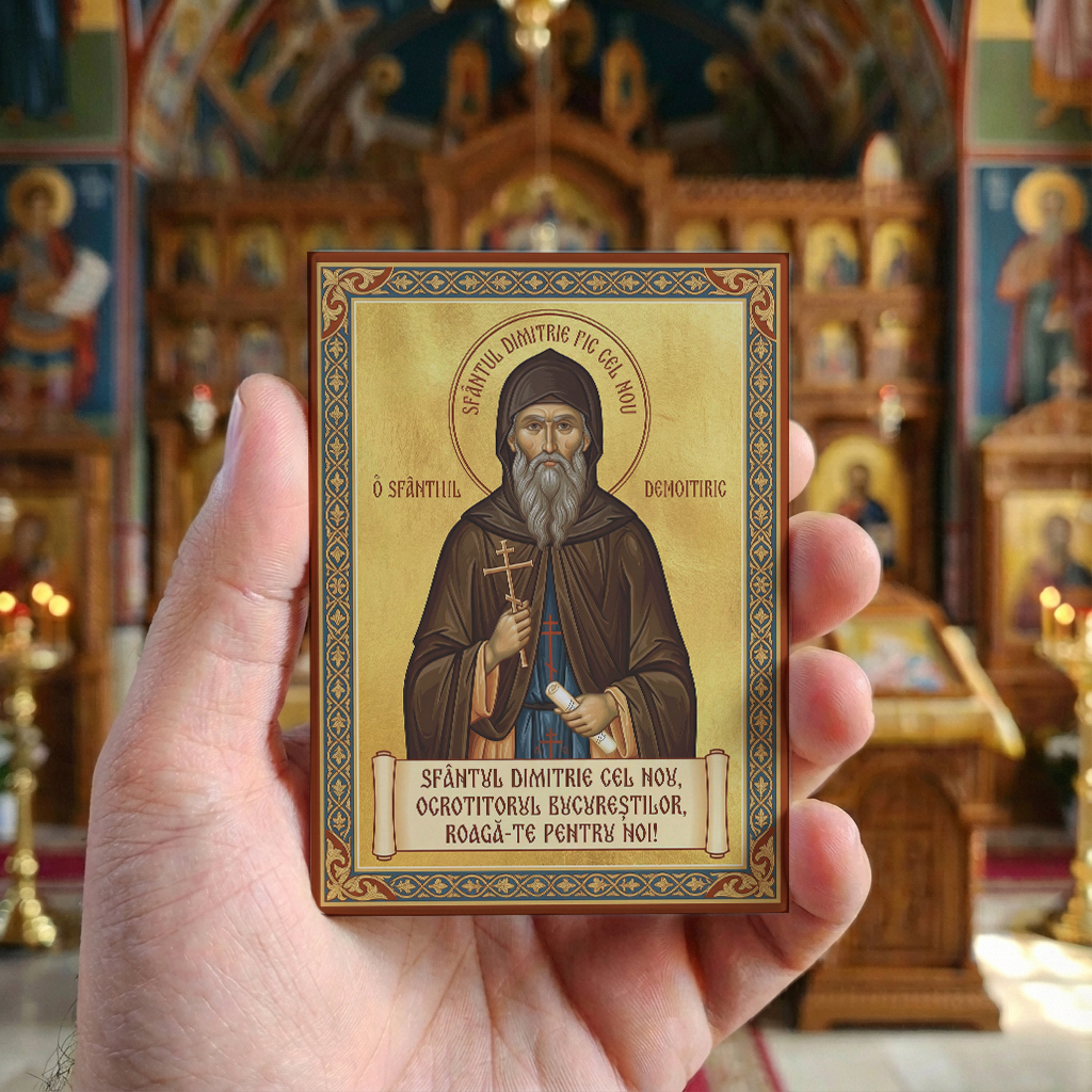 Moaștele Sfântului Dimitrie cel Nou au avut o istorie fascinantă care demonstrează providența divină și grija specială a lui Dumnezeu pentru acest mucenic. După ce au fost salvate de la foc de către creștini evlavioși din Adrianopol moaștele au fost păstrate acolo timp de aproape o sută de ani lucrând numeroase minuni de vindecare și ajutorare. În anul o mie șapte sute șaptezeci și patru în timpul unui război ruso-turc generalul rus conte Petru Rumianțev a cucerit Adrianopolul și a găsit moaștele Sfântului Dimitrie. Fiind impresionat de sfințenia lor și de minunile pe care le făceau el a hotărât să le ducă în Rusia dar pe drum Dumnezeu i-a arătat că moaștele trebuie să ajungă în București capitala Țării Românești unde sfântul s-a născut și unde era menit să devină ocrotitorul spiritual al orașului. Astfel moaștele au ajuns în București în anul o mie șapte sute șaptezeci și patru unde au fost așezate mai întâi la Biserica Sfântul Gheorghe Nou și apoi la Catedrala Patriarhală unde se află și astăzi fiind cea mai prețioasă comoară spirituală a Capitalei. În fiecare an la douăzeci și șapte octombrie sute de mii de credincioși vin în pelerinaj la București pentru a se închina la moaștele Sfântului Dimitrie cel Nou formând cozi imense care demonstrează cât de adânc este înrădăcinată în inima poporului român evlavia față de acest mare mucenic. Acest magnet își găsește locul în orice casă românească mai ales în casele bucureștenilor care îl cinstesc pe Sfântul Dimitrie ca pe ocrotitorul lor special. Pe frigiderul din bucătărie unde familia se adună zilnic pe tabla metalică de lângă ușa de intrare unde poate să pază casa și familia ta sau pe orice suprafață metalică din locuința ta Sfântul Dimitrie cel Nou devine un paznic spiritual care îți oferă protecție împotriva răului și care mijlocește pentru tine în toate nevoile tale spirituale și materiale.