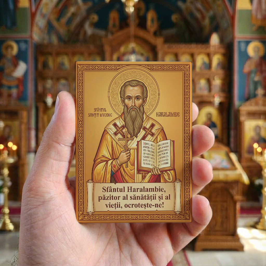 Sfântul Haralambie este venerat în mod special în spațiul românesc și în întreaga lume ortodoxă ca ocrotitor împotriva bolilor și ca doctor ceresc al credincioșilor. Tradiția ne spune că înainte de a fi martirizat, el s-a rugat lui Dumnezeu să îi dea har de a-i ajuta pe toți cei care îi vor cere mijlocirea, în special în privința sănătății trupești. Dumnezeu i-a ascultat rugăciunea și de atunci Sfântul Haralambie a devenit unul dintre cei mai puternici vindecători ai Bisericii. Credincioșii care se îmbolnăvesc grav, care au boli cronice sau care trec prin operații dificile se roagă cu încredere Sfântului Haralambie, știind că el înțelege suferința trupească și că mijlocește cu putere pentru vindecare. Acest magnet își găsește locul în orice casă creștină unde sănătatea și bunăstarea familiei sunt importante. Pe frigiderul din bucătărie unde familia se adună zilnic, pe tabla metalică de lângă patul celui bolnav unde poate veghea și mijloci pentru vindecare, sau pe orice suprafață metalică din locuința ta, Sfântul Haralambie devine un doctor tăcut dar puternic care aduce har dumnezeiesc și speranță de vindecare pentru toți cei din casa ta.