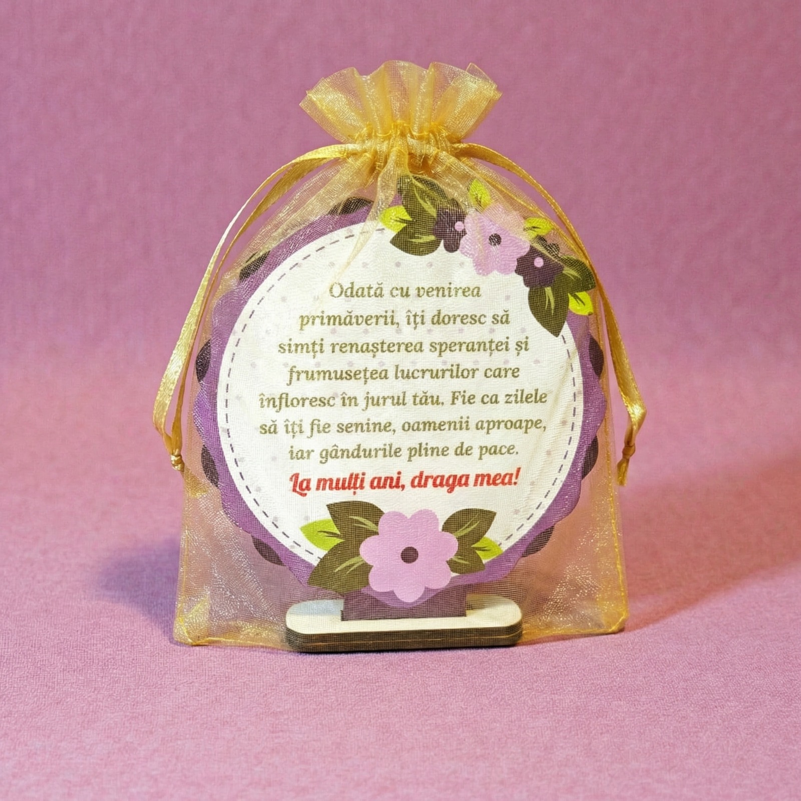 Mesajul inscripționat – „Odată cu venirea primăverii, îți doresc să simți renașterea speranței și frumusețea lucrurilor care înfloresc în jurul tău. Fie ca zilele să îți fie senine, oamenii aproape, iar gândurile pline de pace. La mulți ani, draga mea!” – transformă acest obiect dintr-un simplu cadou într-o amintire de suflet.