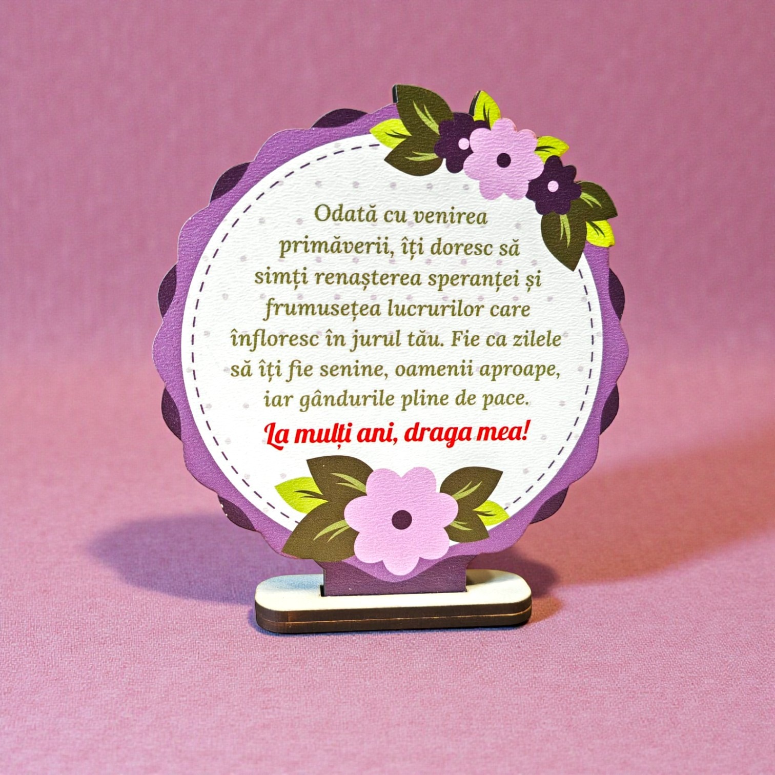Primăvara vine cu bucurie, iar acest mărțișor personalizat este modul perfect de a transmite un gând cald celor dragi. Realizat din PFL alb de calitate, cu un design floral elegant în nuanțe de mov, verde și alb, piesa este printată color și vine montată pe un suport din lemn, gata de expus pe birou sau pe un raft.