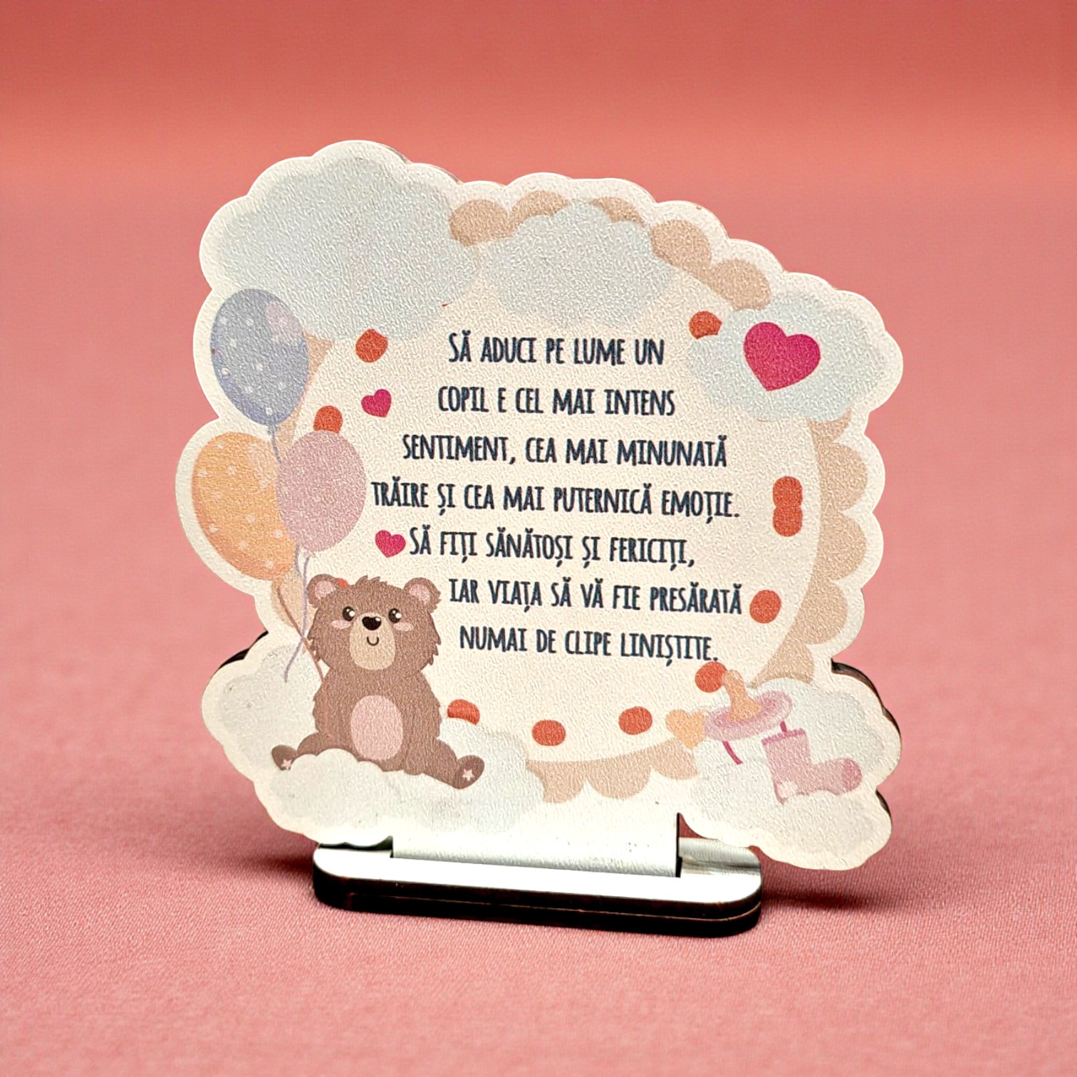 Mărturie botez din lemn cu ursuleț și baloane colorate. Mesaj emoționant despre bucuria de a fi părinte. Dimensiuni: 8.5 x 10 cm. Include bază pentru expunere.
