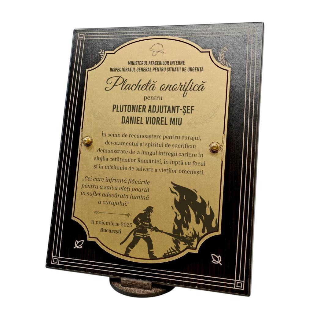 Placheta este realizată din PFL vopsit gold, un material de calitate ce amintește de importanța simbolică a profesiei de pompier și de strălucirea dedicării în salva vieți. Multe persoane au ales această plachetă onorifică și și-au exprimat mulțumirea prin recenzii pozitive, apreciind atât personalizarea mesajului, cât și dimensiunile potrivite de 25x20cm, care o fac ușor de așezat oriunde în locuință sau birou.