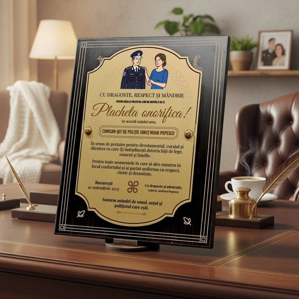 Placheta este realizată din plexiglas de calitate superioară și PFL vopsit gold, două materiale care conferă produsului un aspect elegant, durabil și modern. Dimensiunile generoase de 25x20cm permit gravarea unui mesaj personalizat, astfel încât această plachetă onorifică pentru polițist să devină o amintire de neuitat. Placheta se remarcă prin atenția la detalii, ceea ce face din acest produs o alegere inspirată atunci când cauți cadouri personalizate pentru polițiști.