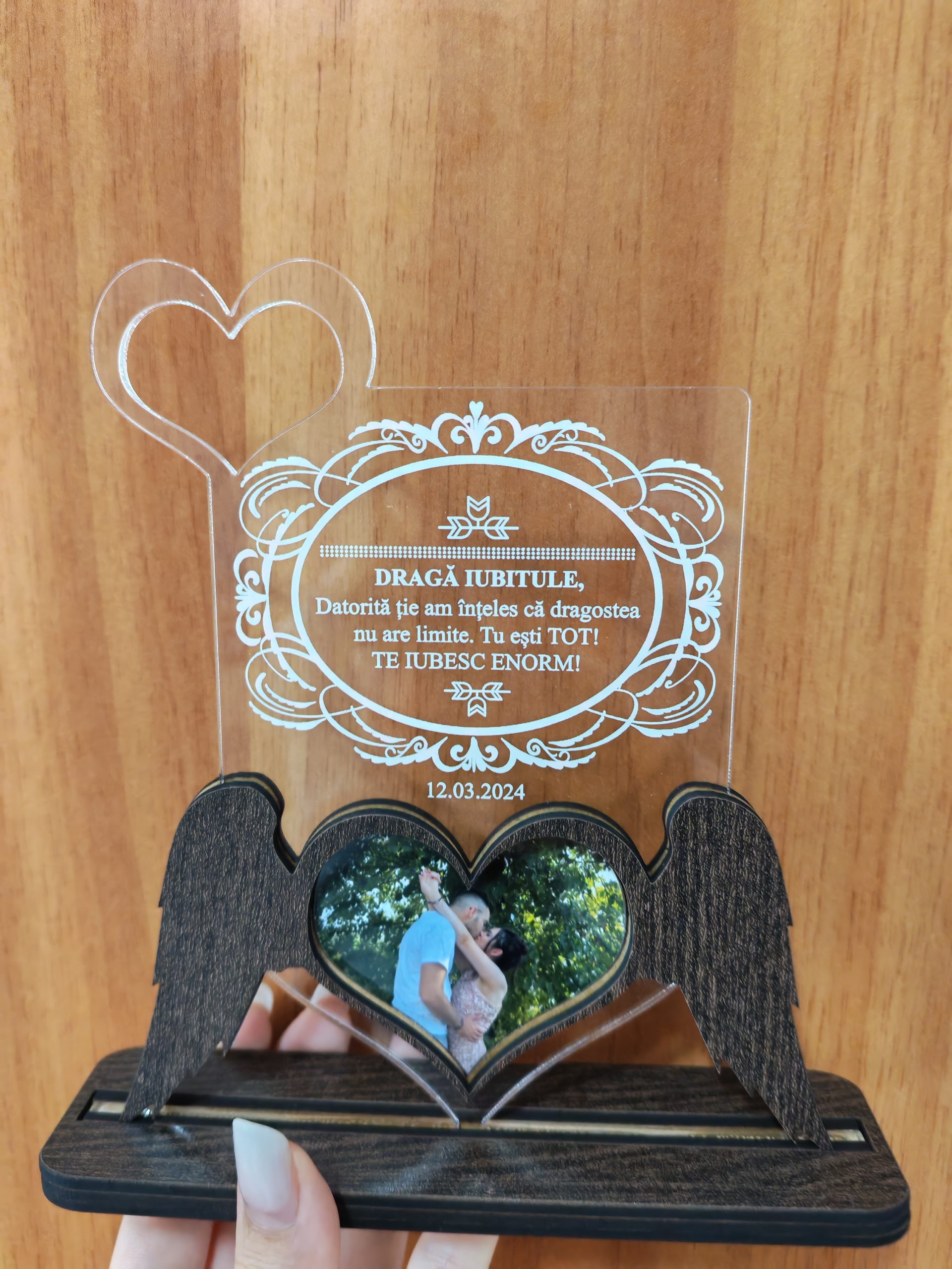 Designul acestui trofeu în formă de inimă cu aripi este atât estetic, cât și plin de semnificație, reprezentând dragostea care te înalță și te inspiră. Personalizarea cu un text și o fotografie alegerea ta adaugă o notă personala și unică, transformând acest trofeu într-un cadou cu adevărat special și personal.