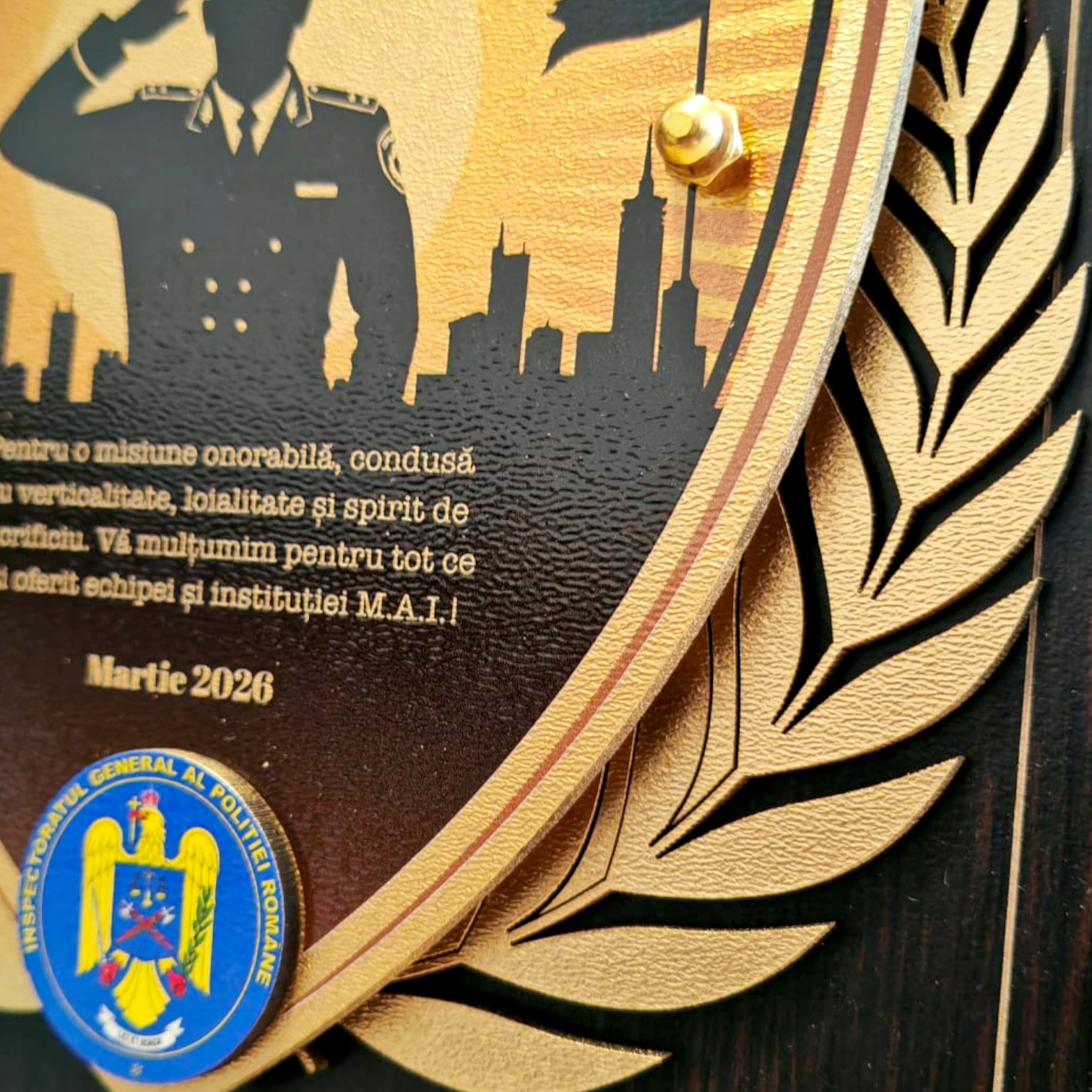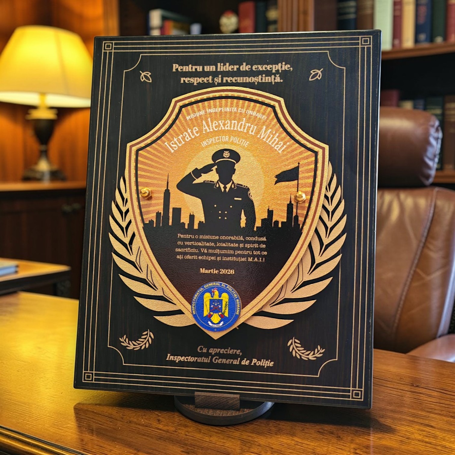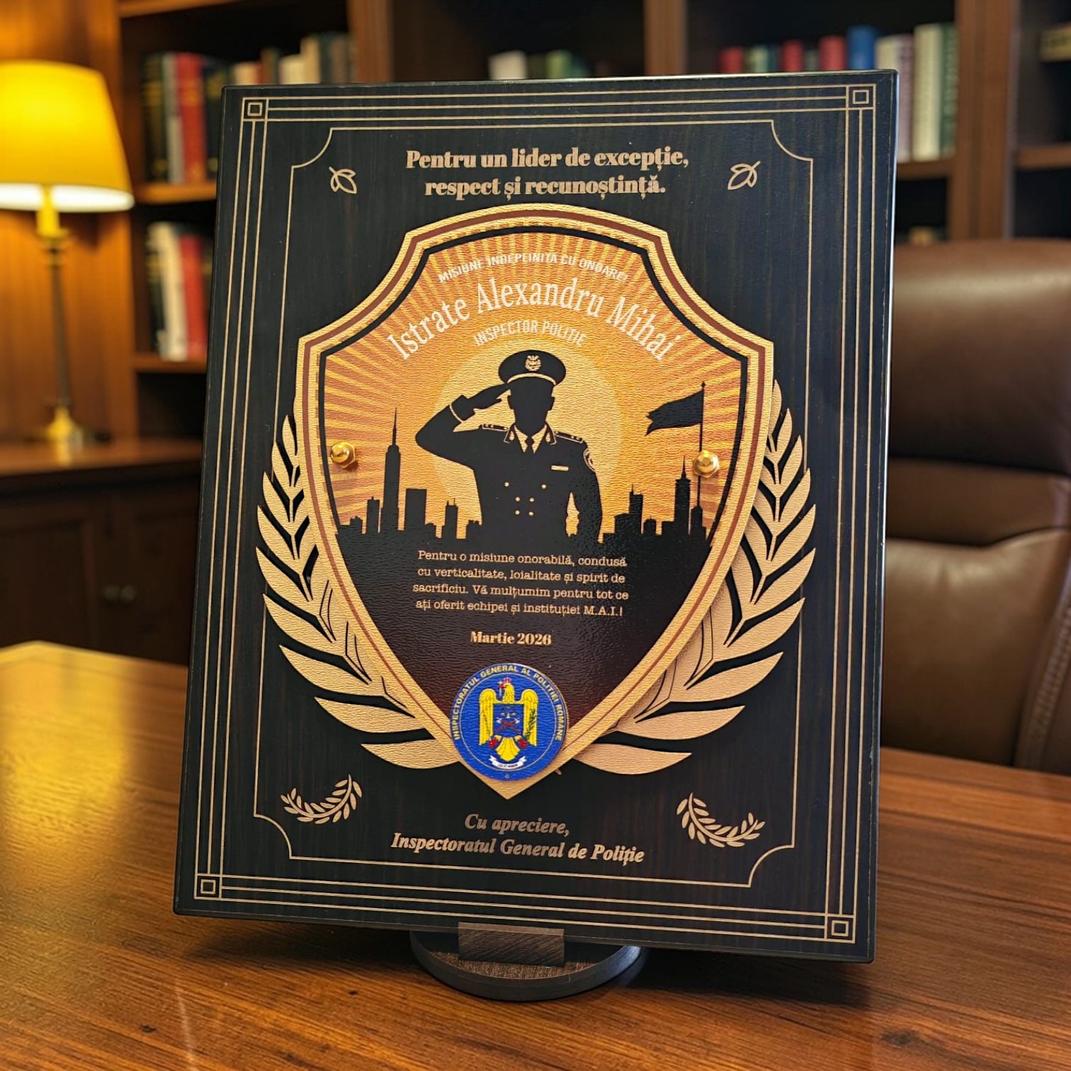 Placheta cu design tematic „Inspector de Politie”, mesaj de apreciere. Personalizarea este inclusa in pret, fiind potrivita pentru pensionare, avansare sau evenimente festive din cadrul institutiei.