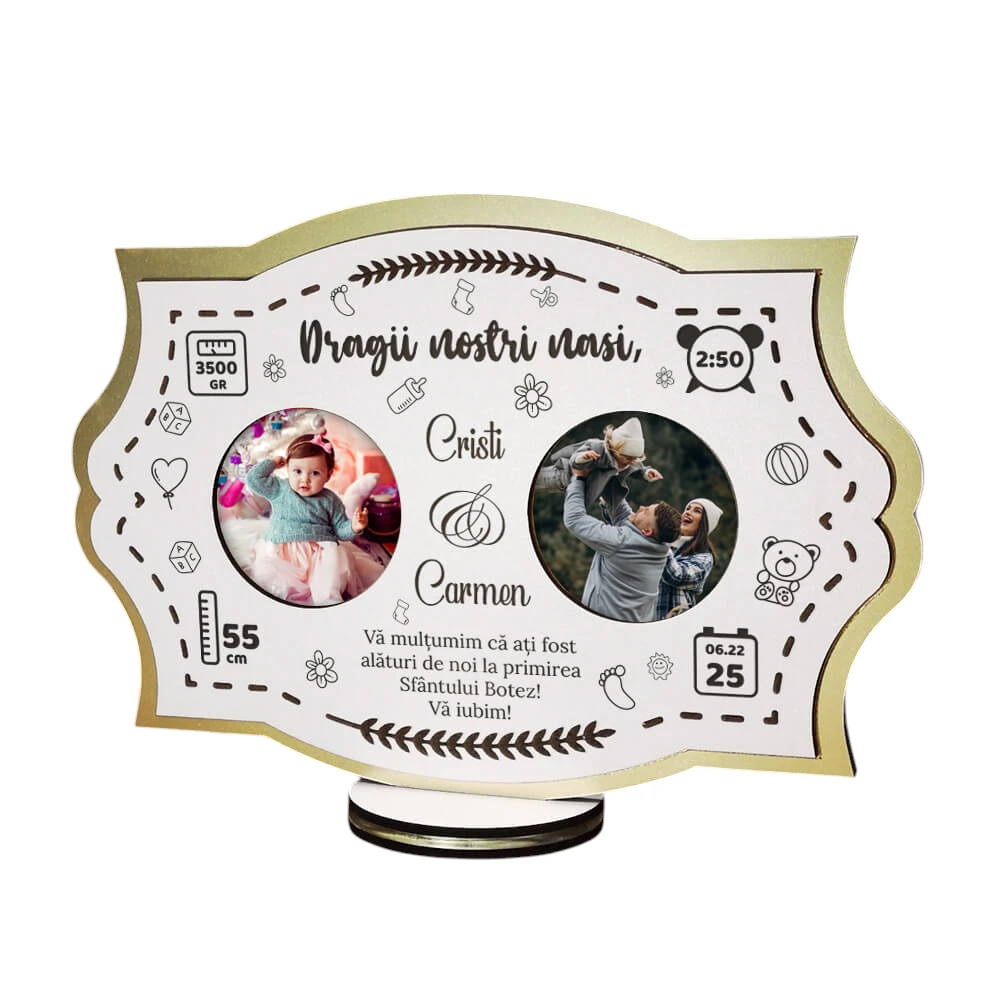 Naşii de botez sunt părinţii spirituali ai celui mic și sunt membrii importanți ai familiei. Să alegi cadouri personalizate prin care să le arăți cât de mult îi preţuieşti este o formă de respect şi apreciere. Să le oferi o ramă foto personalizată, cu ocazia botezului, la petrecerea de luare a moțului, ca dar de Crăciun sau aniversar poate fi cea mai placută modalitate de a-ţi arăta mulţumirea. Produsele realizate din plexiglas, lemn wenge sau lemn alb sunt rezistente şi reușesc să facă faţă, cu succes, probei timpului. Pot fi personalizate cu imagini și mesaje unice, devenind astfel alegeri originale.
