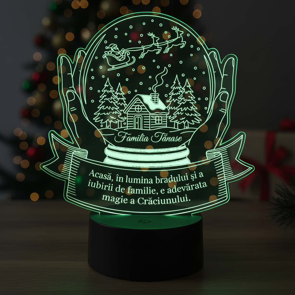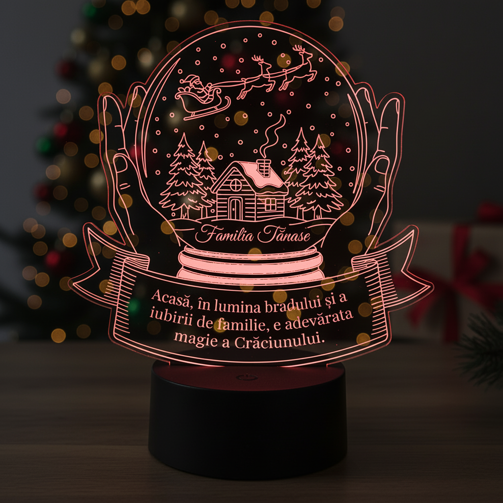 Realizat din plexiglas de înaltă calitate, trofeul personalizat cu LED scoate în evidență atmosfera caldă a sărbătorilor de iarnă și adaugă o notă aparte decorului de Crăciun. Iluminarea discretă pe bază de LED pune în valoare mesajul personalizat și evidențiază simbolul familiei, transformând produsul într-o piesă plină de semnificație, perfectă pentru masa sau biblioteca de sărbători. Dimensiunile sale generoase, de 19×18.3 cm, îl fac potrivit pentru orice locuință și atrag admirația celor care își doresc decoruri originale de Crăciun.