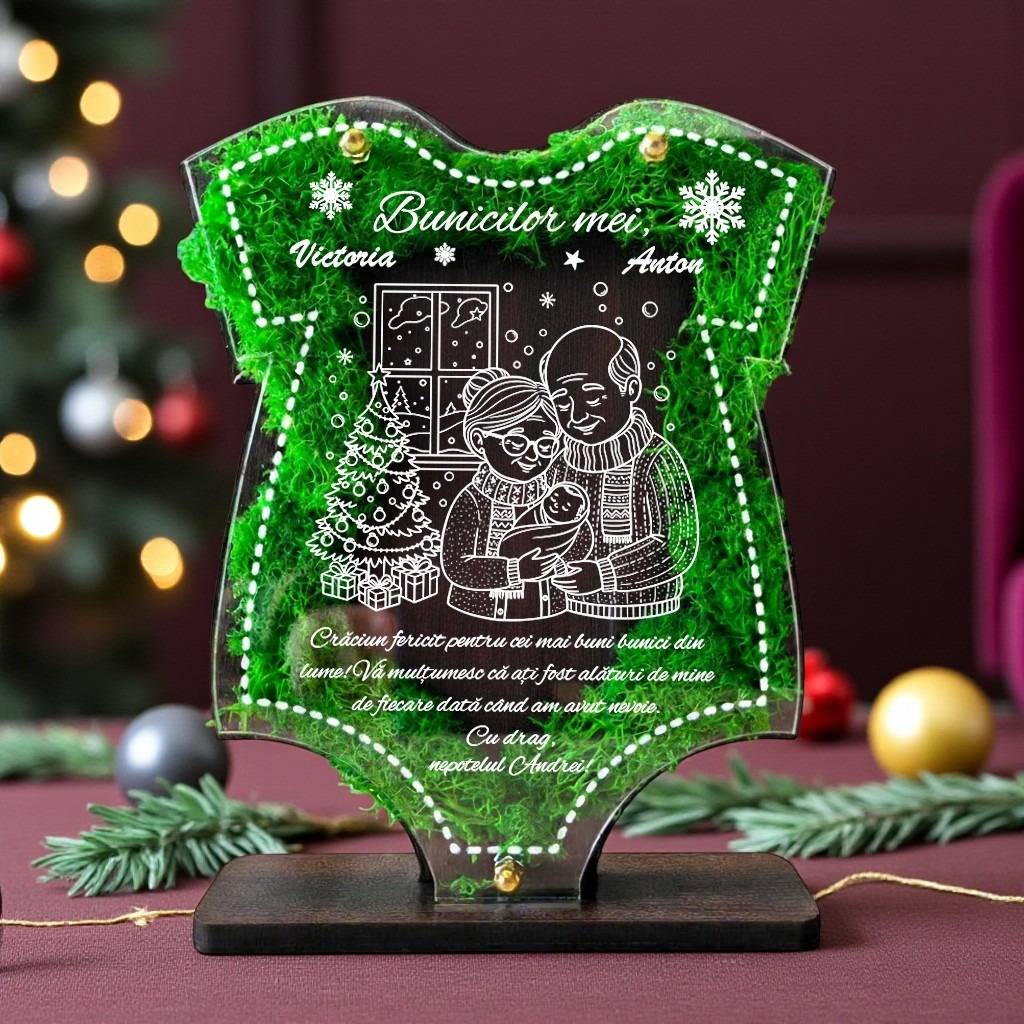 Trofeul este realizat din materiale de calitate, precum pfl wenge și plexiglas, iar combinația acestora oferă un aspect plăcut, modern și elegant. Lichenii decorativi duc cu gândul la natură, prospețime și puritate, aducând o notă de autenticitate fiecărui decor de Crăciun. Având dimensiunea de 22×16 cm și posibilitatea de personalizare, acest trofeu devine o piesă centrală între cadourile de Crăciun pentru bunici, fiind copilărit de mulți clienți ca o idee de cadou cu licheni potrivită pentru Sărbători.