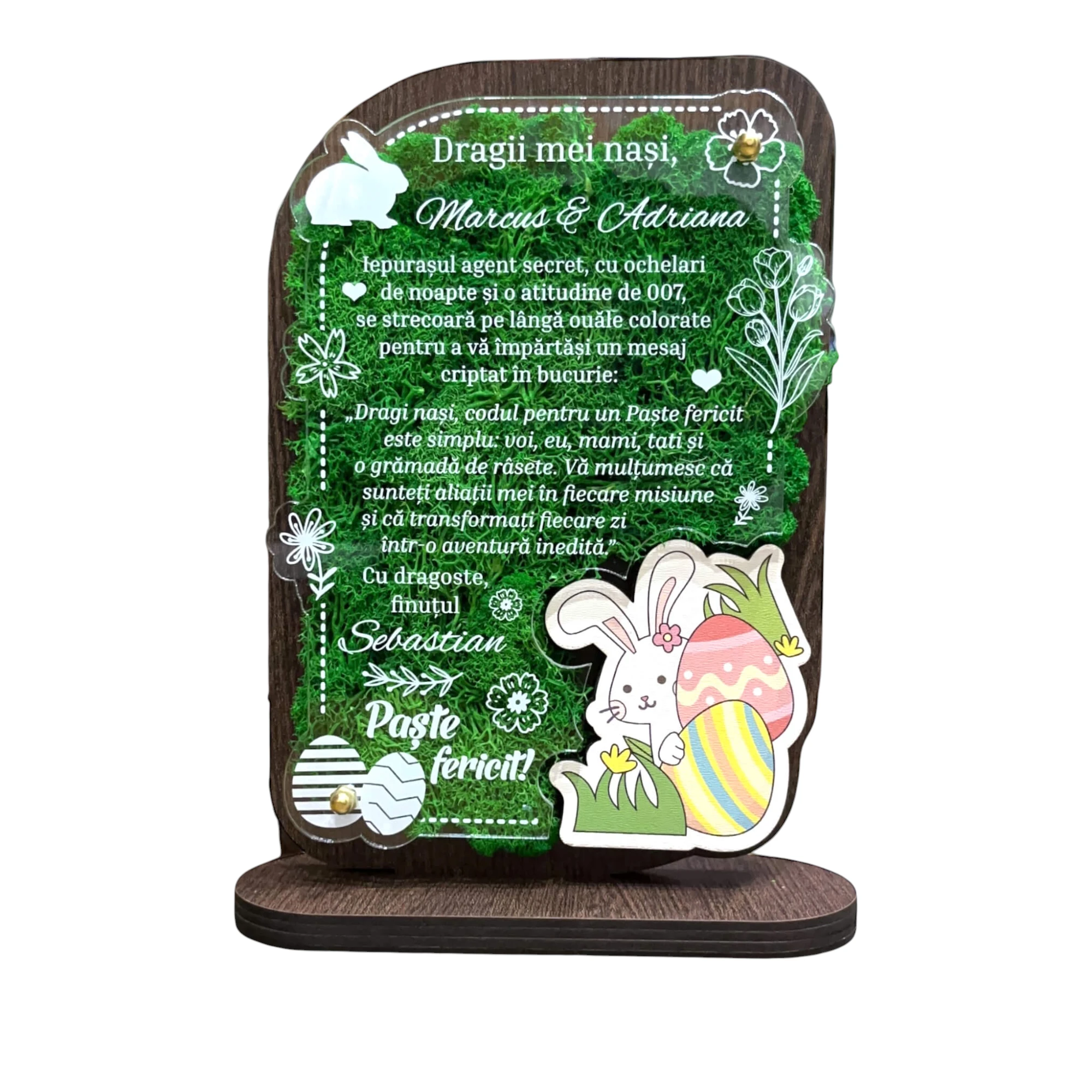 Trofeul personalizat este o alegere perfectă pentru a vă exprima recunoștința față de nașii de botez în această sărbătoare a Paștelui. Realizat din materiale de calitate superioară, acest trofeu combină eleganța cu simbolistica sărbătorii. Elementul central, un iepuraș colorat care apare din spatele unor ouă colorate, adaugă o notă de veselie și culoare, reflectând spiritul pozitiv al Paștelui. Materialele naturale, precum lichenii verzi stabilizați, aduc un omagiu frumuseții și purității naturii, în timp ce designul inovator și personalizarea fac din acest trofeu un cadou cu adevărat unic. Recenziile pozitive subliniază cât de mult sunt apreciate aceste daruri alese, făcând din trofeu o opțiune populară pentru cei care doresc să marcheze Paștele într-un mod cu adevărat special pentru nașii de botez.