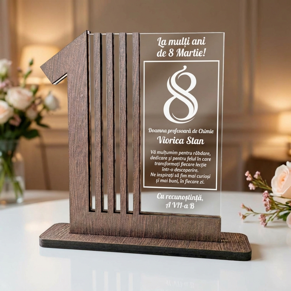 Oferă un trofeu personalizat cu mesaj de apreciere, realizat din lemn wenge (PFL) și plexiglas, cu print inclus. Este cadoul potrivit pentru 8 Martie atunci când vrei să mulțumești doamnei profesoare de chimie pentru răbdare și implicare.