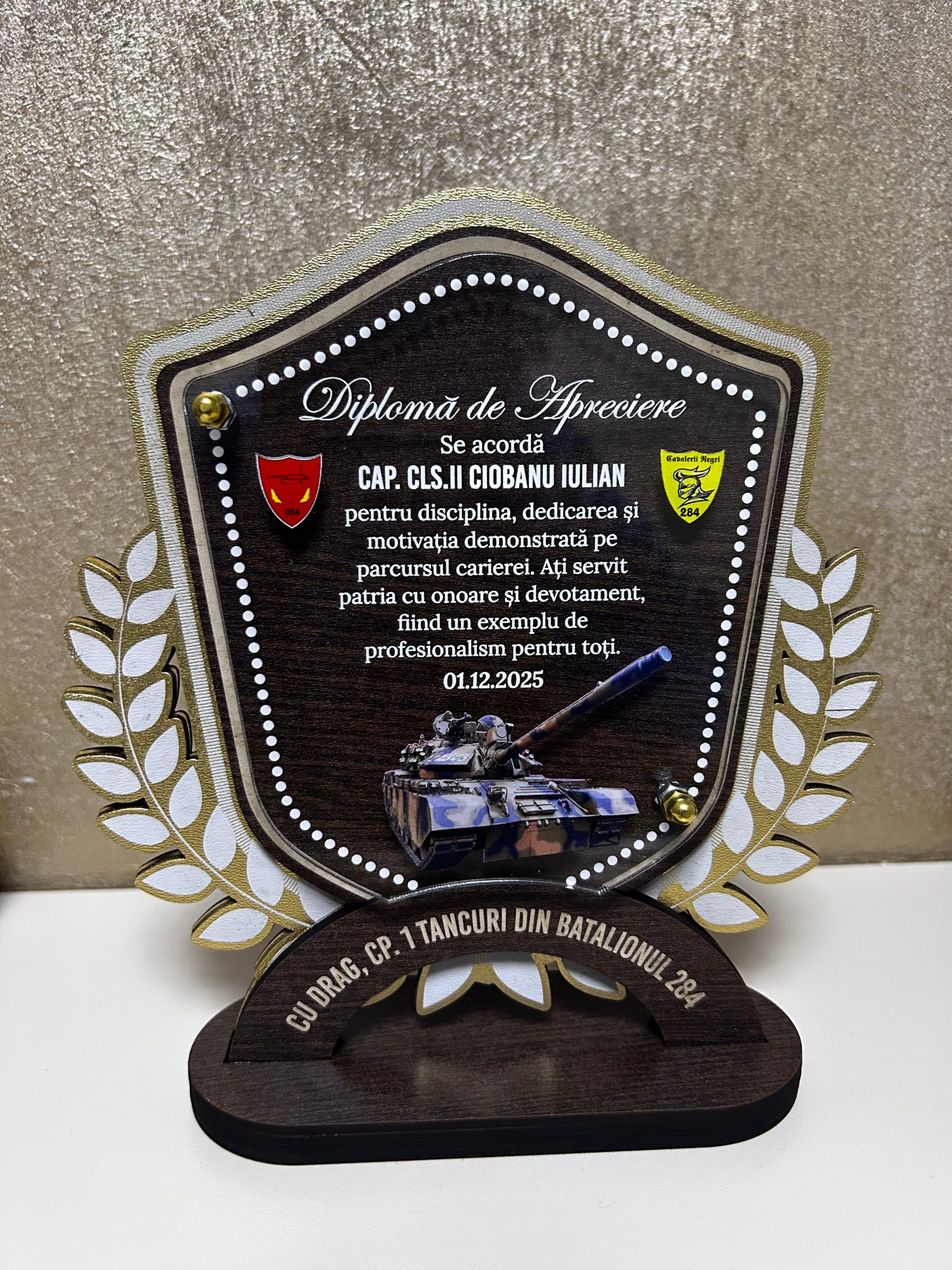 Fabricat din plexiglas de înaltă calitate și disponibil cu diverse opțiuni de personalizare, acest trofeu este ideal pentru a onora cariera militară a unei persoane dragi. Designul său, ce poate fi ajustat pentru a reflecta specificitățile și realizările individului, împreună cu inscripția personalizată, adaugă o notă personală și unică cadoului. Faptul că a fost deja achiziționat și apreciat de alți cumpărători, așa cum se reflectă în recenzii, subliniază calitatea și relevanța sa ca alegere ideală.