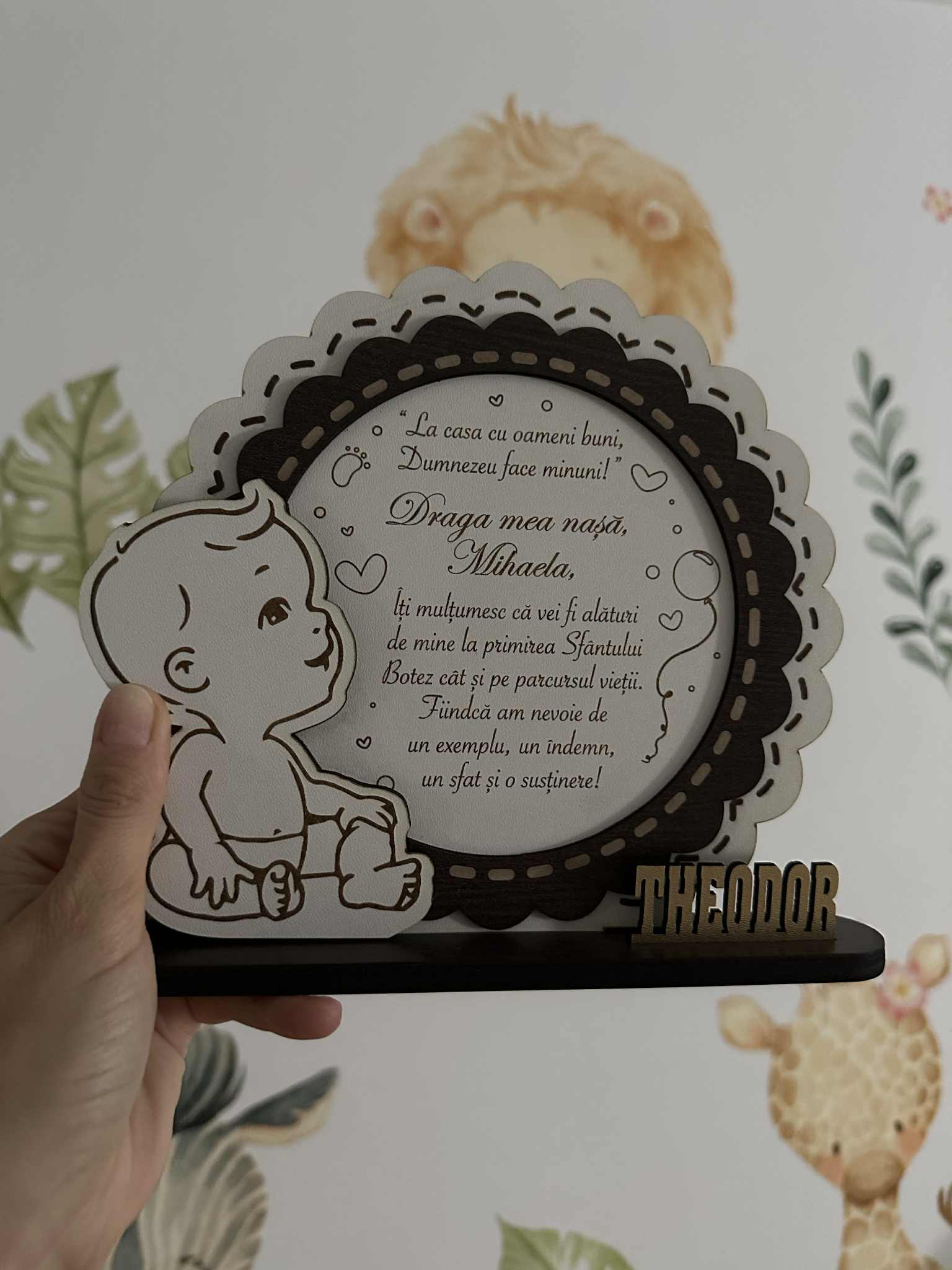 Textul poate fi schimbat cu cel dorit de dumnevoastra, pentru a transforma acest cadou cu cererea nasilor, intr-unul de suflet. Aducandu-le aminte de fiecare data ca odata cu cadoul primit, au devenit si ei parte din familia voastra.