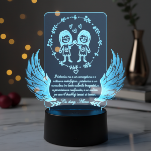 Acest suport de lampă din plexiglas are dimensiuni de 20.5×15.5cm și este un cadou perfect pentru mame și soacre. Fiecare detaliu este gândit cu grijă, iar decorul cu flori și nuanțe de alb și roșu creează o atmosferă caldă și plăcută. Lichenii care completează designul evocă natura și puritatea, aducând un strop de verdeață în orice cameră. Mesajul dedicat, evidențiat printr-un font elegant, este parte integrantă a acestui trofeu personalizat, care a fost apreciat de numeroase persoane, conform recenziilor primite. Oferindu-l, veți aduce bucurie în inimile celor dragi, transformând orice ocazie specială într-un moment de neuitat.