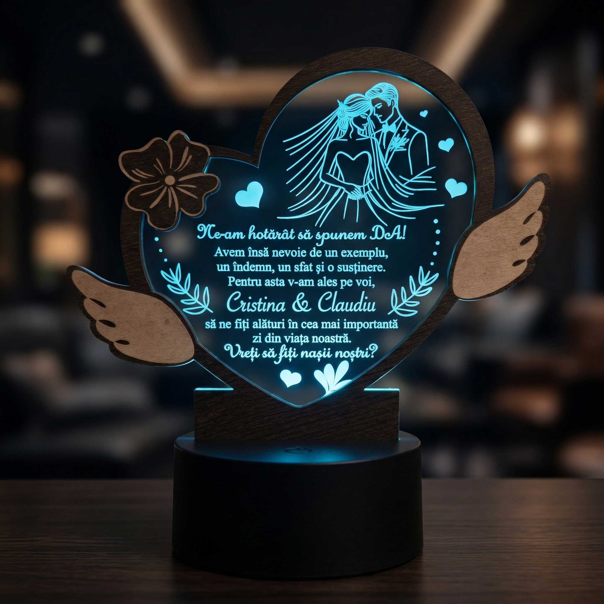 O cerere de nasi merita un cadou care sa transmita emotie si recunostinta, nu doar cateva cuvinte rostite in graba. Aceasta lampa LED personalizata transforma momentul intr-o amintire pastrata in casa, zi de zi.