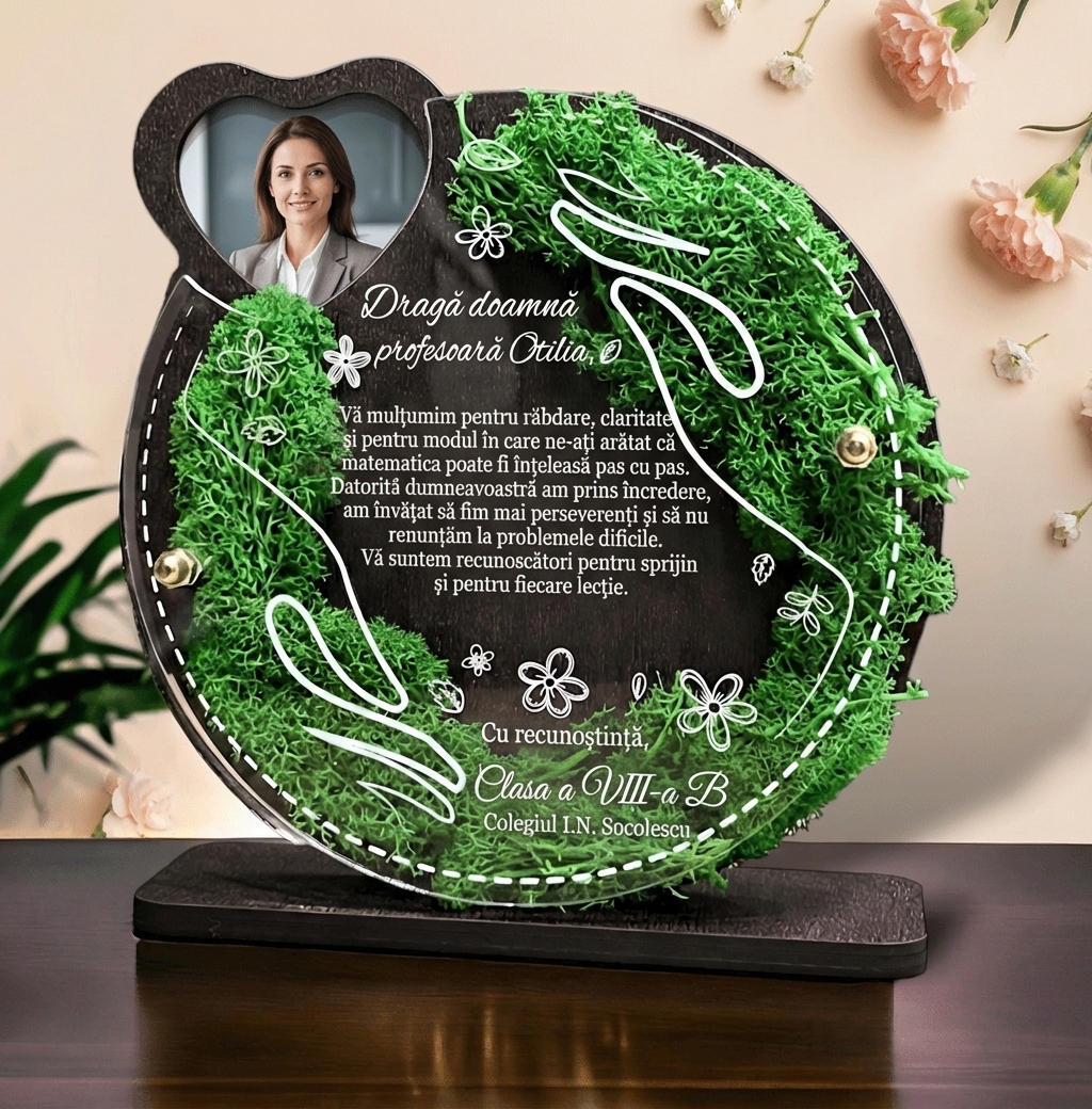 Trofeul decorativ are o formă rotundă, este în nuanță închisă, realizat din PFL Wenge și plexiglas, cu licheni verzi integrați în design. Personalizarea este prin print și include textul de mulțumire, numele (opțional) și elementele grafice ca în model (linii punctate, contururi și floricele). Are foto în formă de inimă cu portret feminin generic și vine cu bază/stand pentru expunere stabilă. Ideal ca trofeu pentru profesori, cadou 8 Martie pentru profesoară sau cadou de final de an școlar.