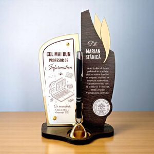 Acest trofeu este proiectat special pentru a omagia cea mai bună profesoară de fizică, fiind realizat din materiale de calitate precum pfl wenge și plexiglas, cu accente elegante din oglindă plexiglas gold. Dimensiunile de 24×15 cm îl fac ideal pentru a fi afișat cu mândrie în orice cadru profesional sau personal. Este un simbol al recunoștinței care reflectă stima și admirația față de munca depusă, fiind un reper al respectului și aprecierii elevilor săi.