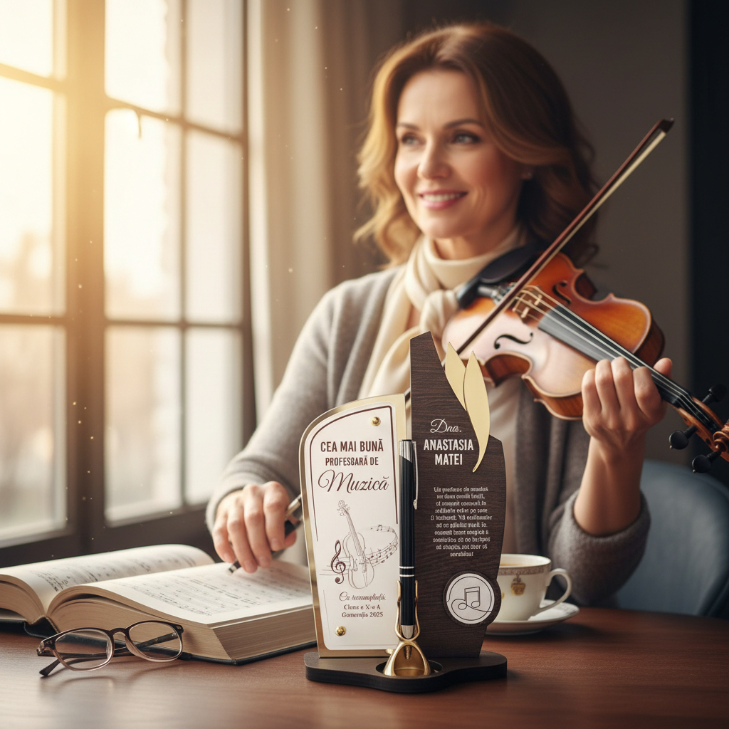Acest trofeu personalizat cu pix este realizat din PFL wenge, plexiglas și oglindă din plexiglas gold, combinând eleganța cu un design modern, ce aduce un omagiu profesionalismului profesorului dvs. de muzică. Cu posibilitatea de personalizare și un pix inclus, trofeul devine un cadou perfect, a cărui calitate și originalitate reflectă aprecierea profundă pentru destinatar.
