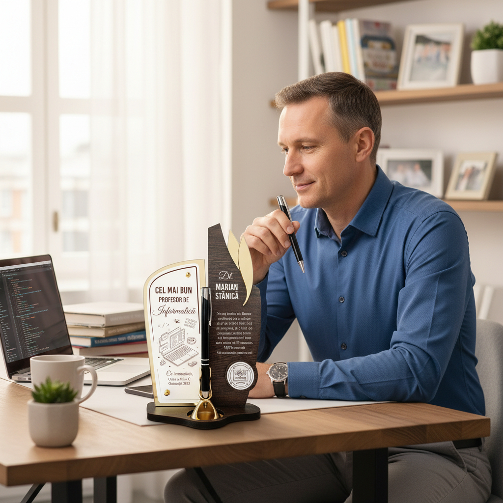 Acest trofeu, structurat din materiale de calitate precum PFL wenge, plexiglas și oglinda plexiglas gold, nu numai că subliniază eleganța, dar stă și drept o simbolizare a aprecierii durabile. Combinat cu un pix integrat, trofeul nu este doar un obiect decorativ, ci și unul funcțional, ce aduce zilnic aminte de realizările profesorului.
