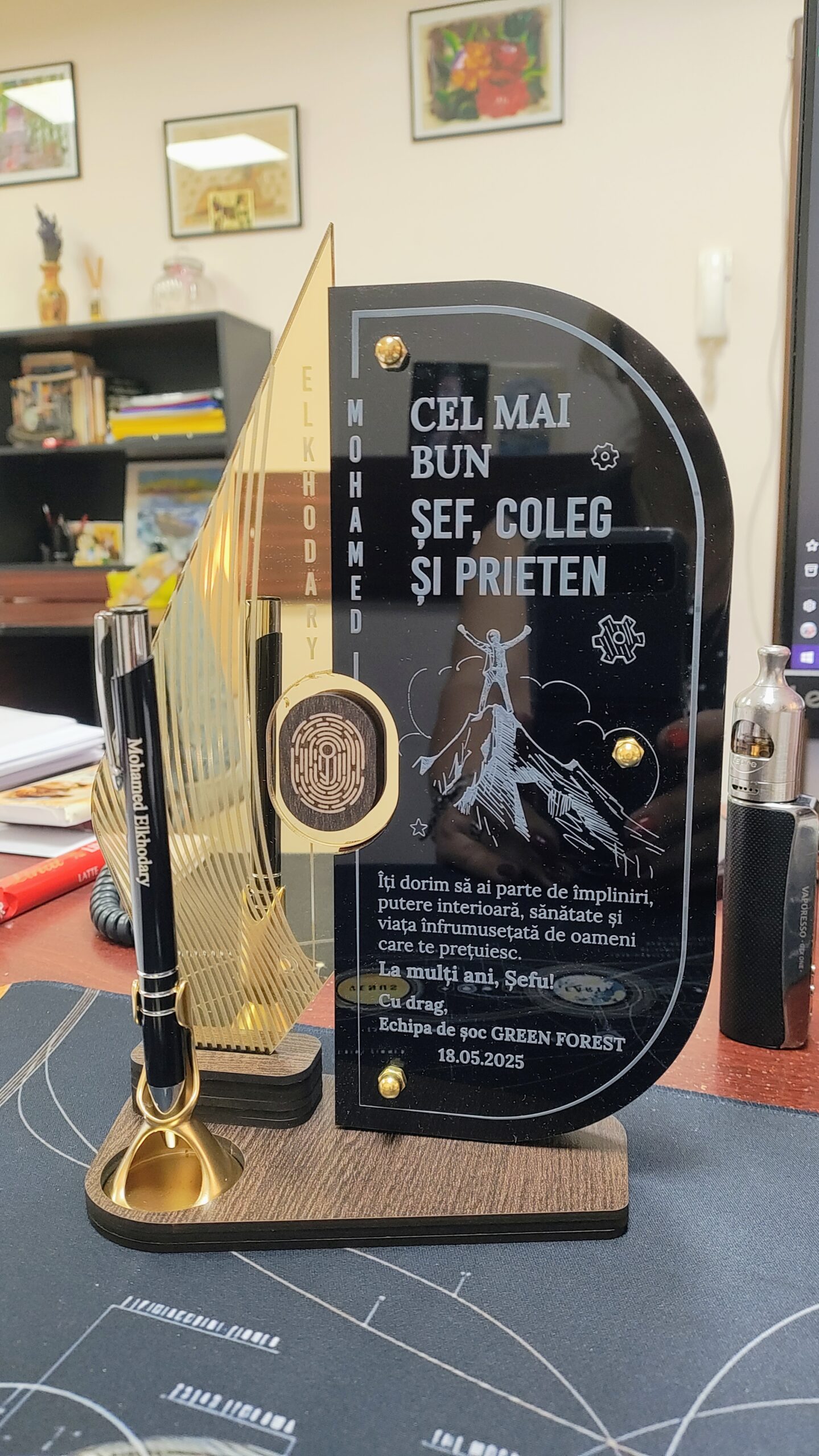 Acest trofeu combină materiale de calitate precum pfl wenge, oglinda de plexiglas aurie, și plexiglas în nuanțe de negru și alb satinat, conferind un aspect luxos și contemporan. Dimensiunile de 25x17cm fac din acest trofeu o piesă de artă personalizată, ideală pentru biroul unui lider de succes, fiind totodată un simbol al excelenței și al inovației în designul de trofee.