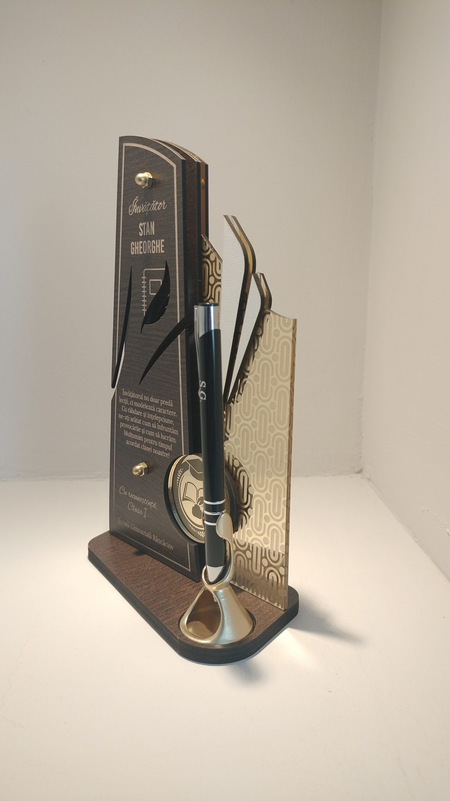 Realizat din materiale de calitate precum PFL wenge, PFL alb și oglindă de plexiglas aurie, acest trofeu aduce un omagiu profesorului într-un mod elegant și sofisticat. Pixul încorporat, nu doar că adaugă funcționalitate produsului, dar transformă întregul trofeu într-un instrument practic de scriere. Personalizarea acestuia cu numele dirigintelui sau cu un mesaj special, face din acest trofeu un cadou unic și plin de semnificație. Multiplele recenzii pozitive reflectă aprecierea cumpărătorilor pentru calitatea și utilitatea trofeului.
