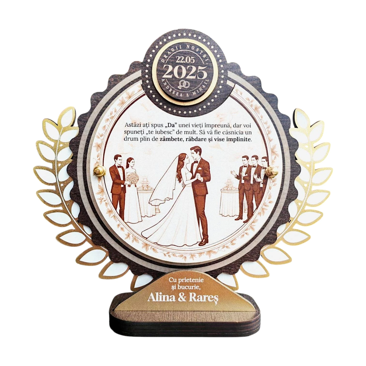 Produsul e lucrat frumos, personalizarea a fost exact cum am dorit. Mirele și mireasa au fost încântați.
