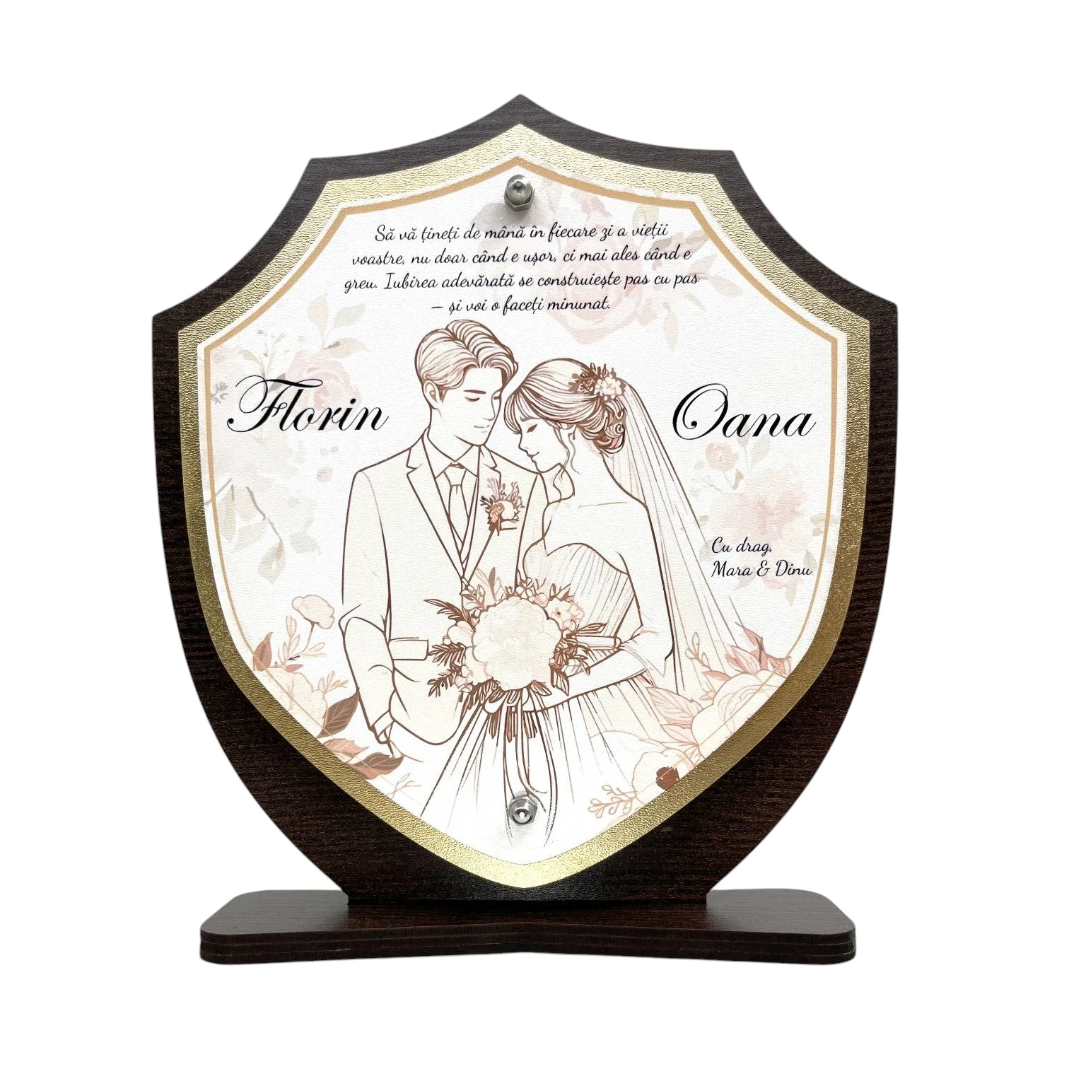 Acest trofeu de nuntă, realizat din pfl wenge, pfl alb, plexiglas și accentuat cu pfl vopsit gold, evidențiază rafinamentul și simplitatea elementelor naturale combinate într-un design elegant. Fiecare material folosit conferă produsului durabilitate și un aspect desăvârșit, iar gravarea personalizată face ca acest trofeu să devină un cadou personalizat de nuntă cu totul special, o amintire vizuală pentru cuplurile care își încep drumul împreună. Dimensiunea generoasă de 23×20 cm îl face potrivit pentru a fi expus cu mândrie în casa mirilor, păstrând vie amintirea unui moment unic.