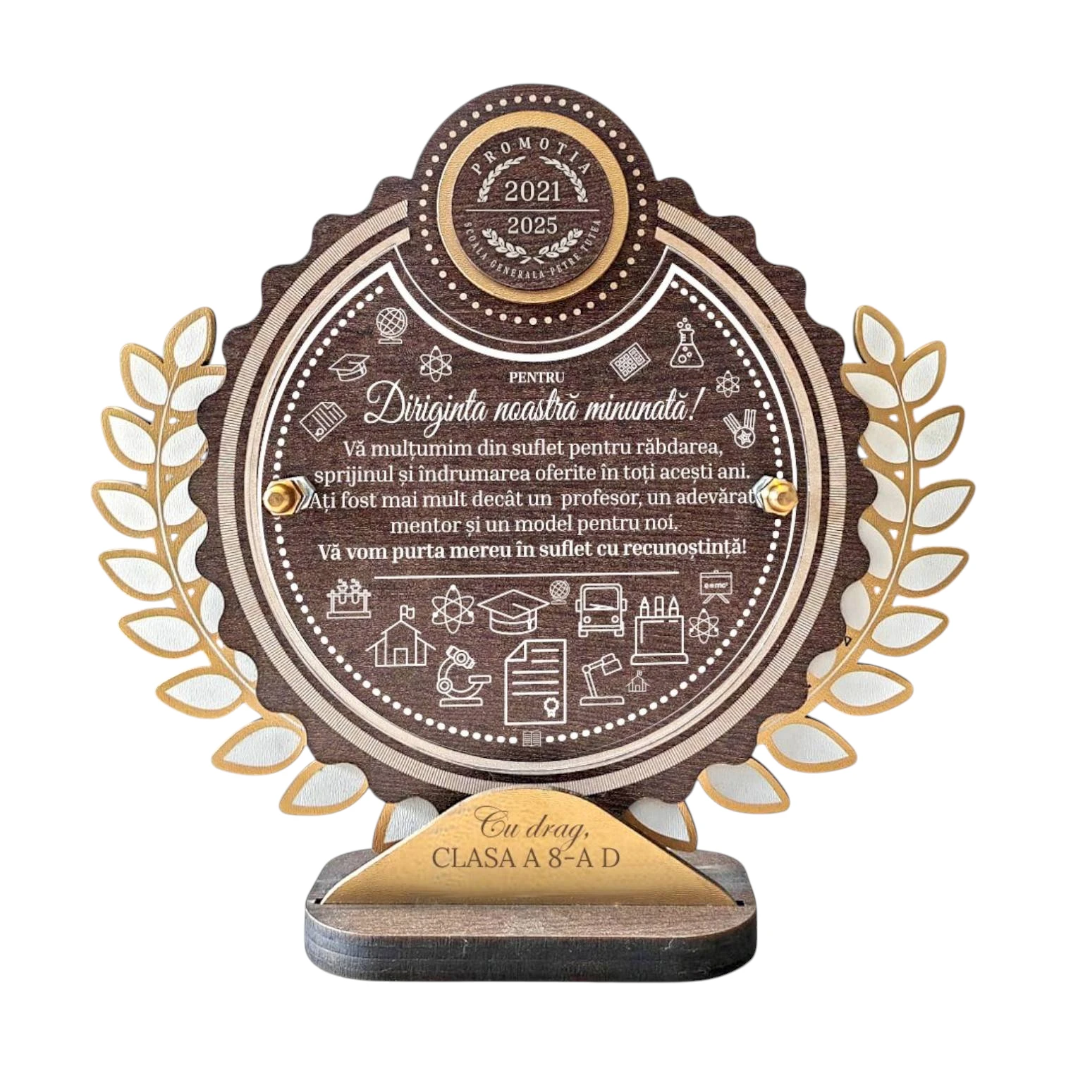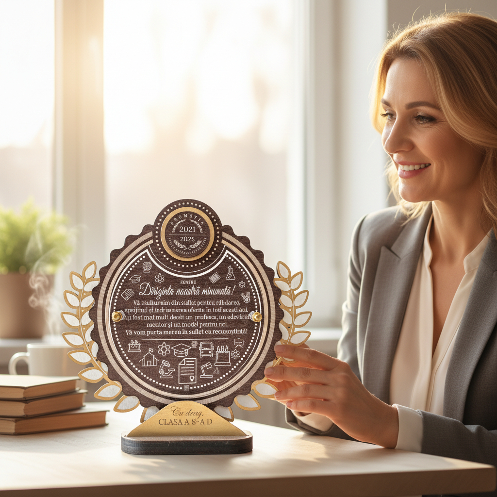 Acest trofeu personalizat este fabricat din materiale de înaltă calitate, inclusiv PFL wenge, plexiglas și PFL vopsit în nuanță de aur, care îi conferă un aspect elegant și sofisticat. Cu dimensiuni de 21×22 cm, acest produs nu doar că se face remarcat prin designul său distinct, dar este și un simbol al aprecierii profunde. Recenziile pozitive reflectă satisfacția multor cumpărători care au ales să își exprime gratitudinea prin acest gest valoros.