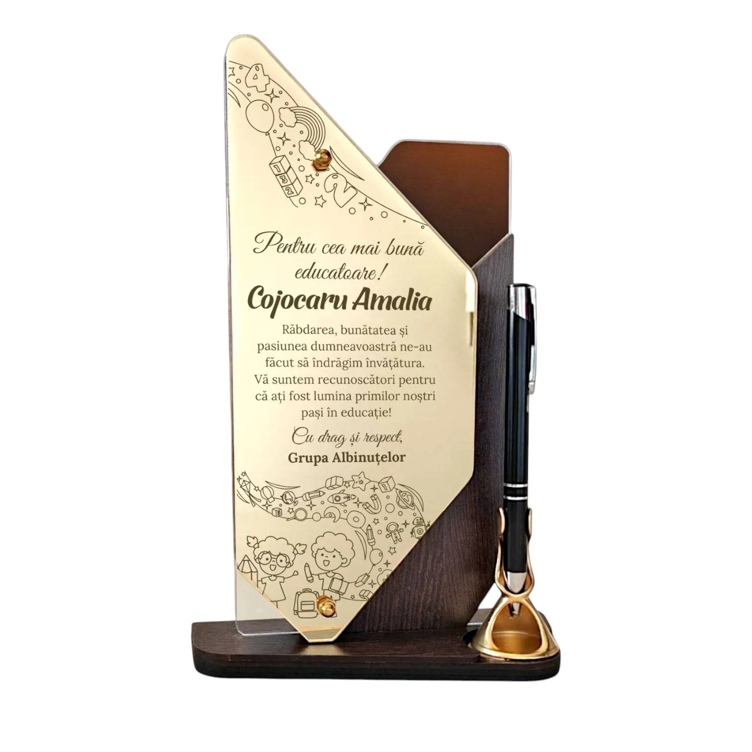 Acest trofeu personalizat pentru educatoare este realizat din materiale premium, precum pfl wenge și plexiglas, complimentat de elemente din oglindă plexiglas gold, conferindu-i nu doar durabilitate, dar și un aspect elegant. Dimensiunile de 25×13 cm îl fac ideal pentru a fi expus în orice mediu educațional, iar pixul inclus adaugă o utilitate practică acestui cadou memorabil. Recenziile pozitive subliniază satisfacția cumpărătorilor care l-au ales ca simbol de gratitudine pentru dedicarea educatoarelor.