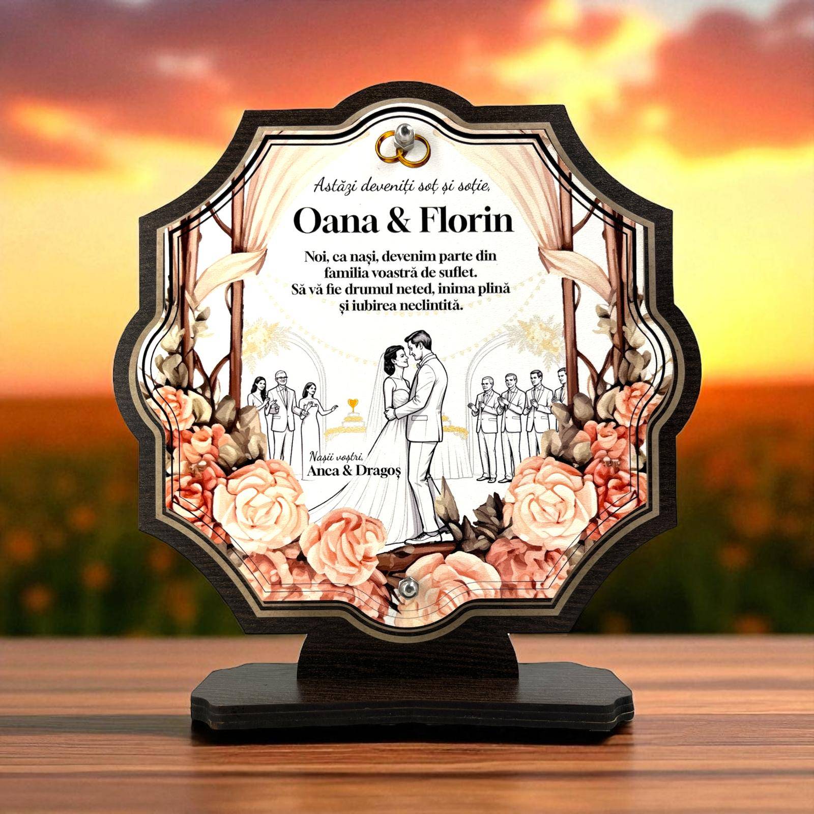 Acest trofeu este realizat din materiale durabile precum PFL wenge, PFL alb și plexiglas, combinând aspectul modern cu o notă de rafinament discret. Personalizarea permite transmiterea unui mesaj unic din partea nașilor pentru miri, ceea ce îl transformă într-un cadou unic pentru nuntă și o dovadă simbolică a legăturii dintre cei implicați.