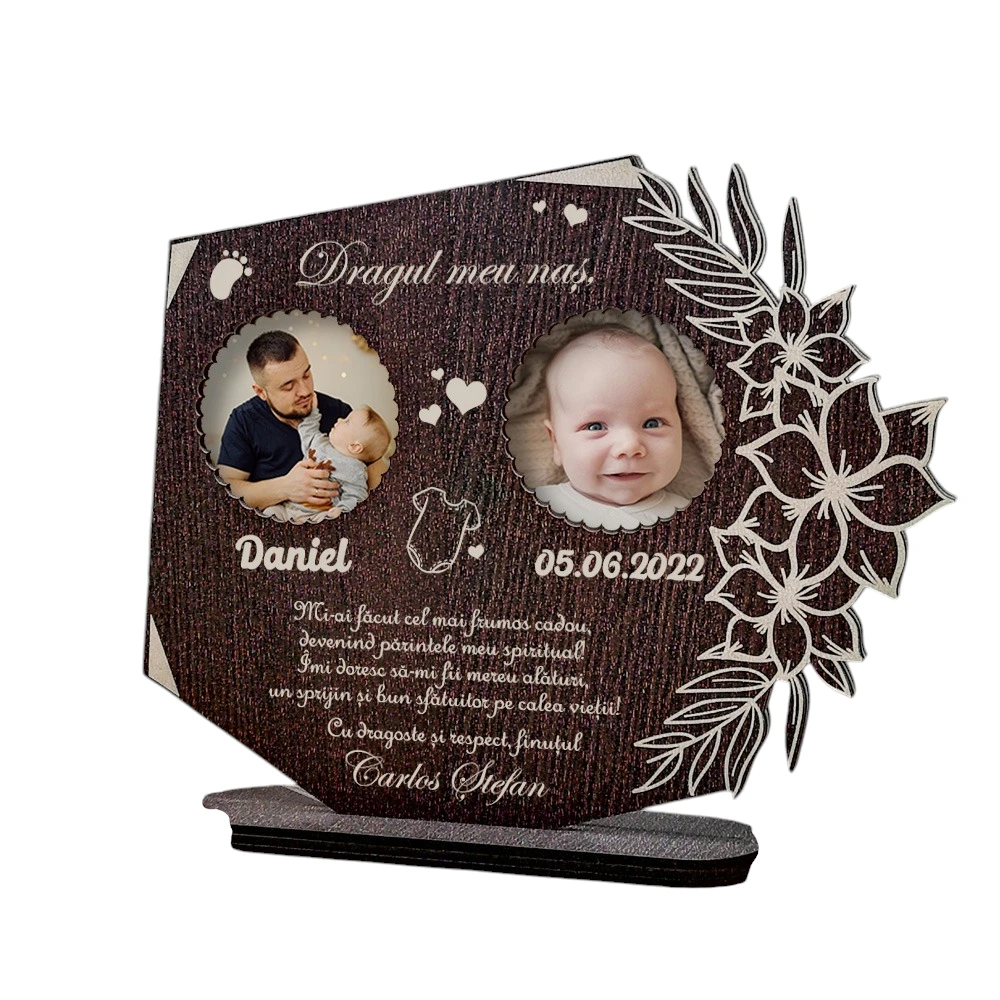Trofeul personalizat, cu dimensiuni de 18x22cm, este realizat cu atenție la detalii, devenind un suvenir special pentru nașii de botez. Materialul de calitate asigură durabilitatea și eleganța acestui cadou, în timp ce posibilitatea de a adăuga două fotografii face ca fiecare trofeu să fie unic și plin de emoție. Acest gest de recunoștință va rămâne mereu prezent în amintirile nașilor, care vor aprecia acest cadou personalizat ca pe o dovadă a legăturii speciale cu copilul. Recenziile pozitive ale cumpărătorilor reflectă satisfacția și bucuria adusă de acest cadou, fiind o alegere inspirată pentru orice ocazie deosebită.