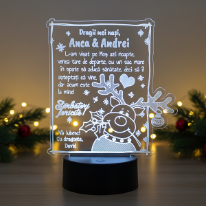 Surprinde-ți bunicii cu un cadou special de Crăciun, un trofeu personalizat din plexiglas care măsoară 20×16 cm. Acest produs elegant, iluminat cu LED-uri multicolore, nu doar că aduce un strop de magie în orice încăpere, dar și duce cu gândul la momentele de neuitat petrecute împreună. Gravați un mesaj personalizat pentru a le aduce aminte de cât de mult înseamnă pentru tine și bucură-te de recenziile pozitive primite de la alți cumpărători mulțumiți de cadourile personalizate pentru bunici. Alege un suvenir care evocă emoții și amintiri dragi, perfect pentru a sărbători legătura cu cei dragi în această perioadă festivă.