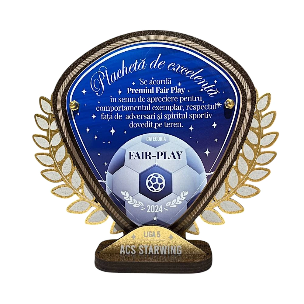 Acest trofeu combină materiale de înaltă calitate precum pfl wenge și plexiglas, cu detaliile vopsite în nuanțe de gold, oferind un aspect elegant și durabil. Dimensiunile de 21x23cm îl fac suficient de vizibil pentru a impresiona și a sta mândru în orice vitrină sau cameră dedicată trofeelor.
