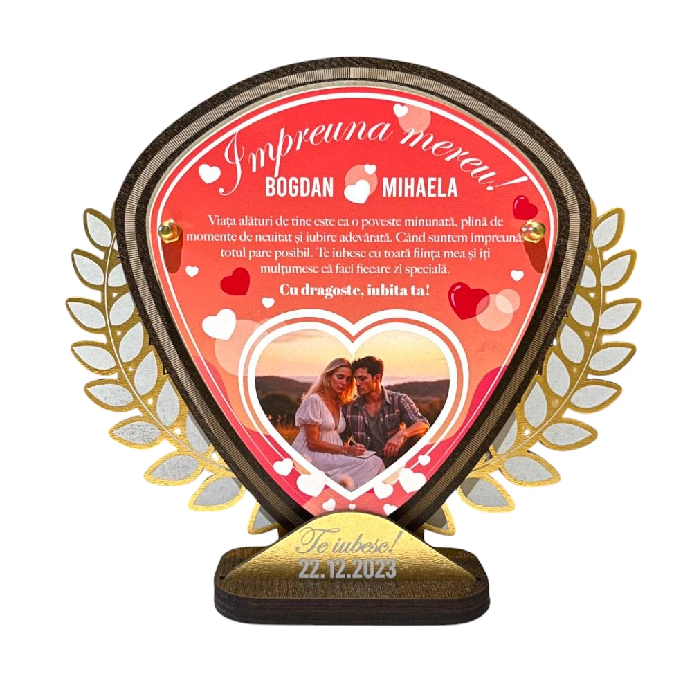 Acest trofeu personalizat este confecționat din materiale de calitate superioară, precum PFL wenge, PFL alb, plexiglas și PFL vopsit în nuanțe de gold, care îi conferă un aspect estetic deosebit și rezistență în timp. Dimensiunile de 21×23 cm îl fac ideal pentru a fi expus în orice încăpere, aducând un element de rafinament și personalitate. Alegând să personalizați acest trofeu, veți avea ocazia de a transmite un mesaj profund de dragoste, creând astfel nu doar un cadou, ci și o amintire prețuită.