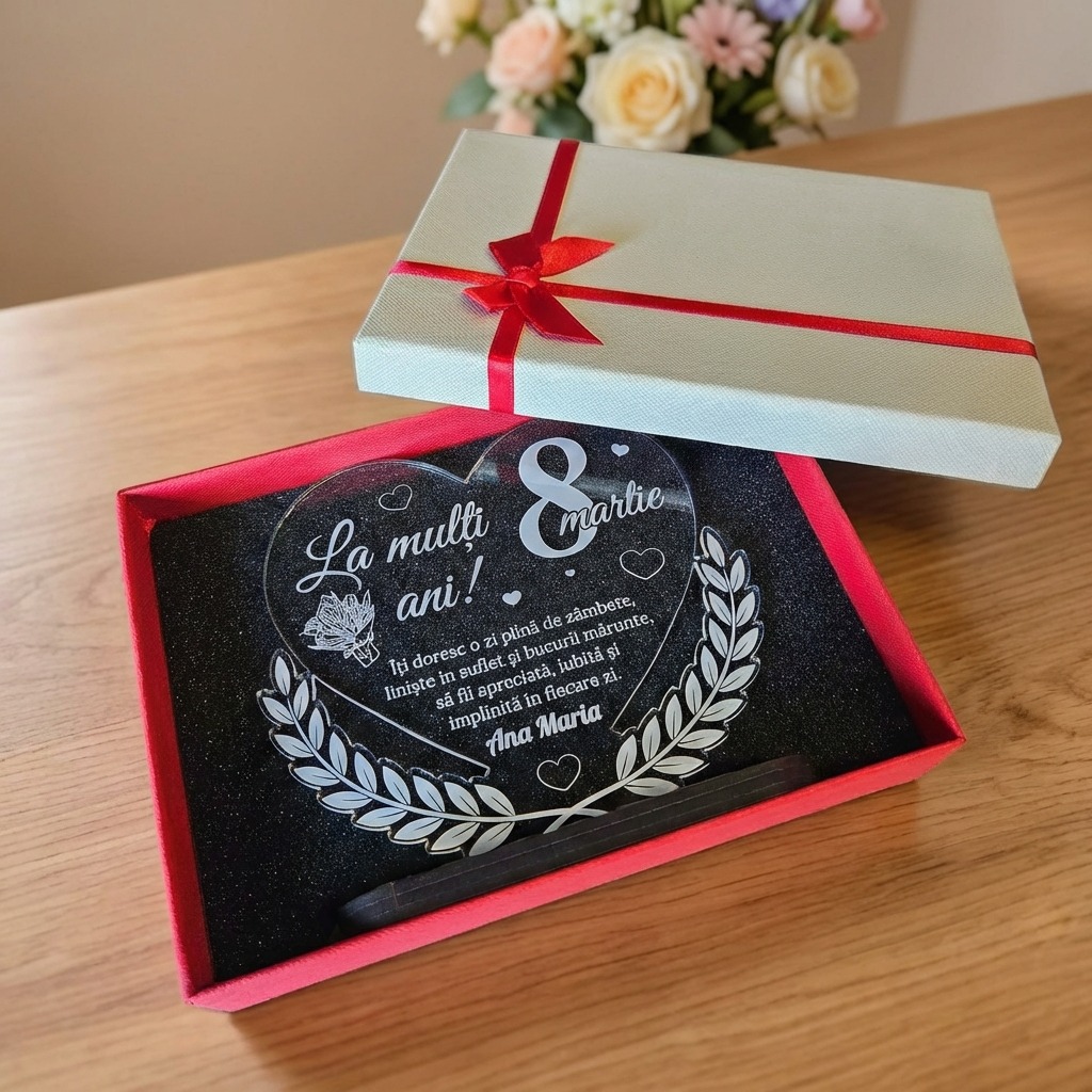 Acest trofeu personalizat din plexiglas transparent este cadoul ideal pentru a celebra femeile speciale din viața ta de 8 Martie. Forma de inimă decorată cu ramuri de laur și inimi delicate, combinată cu un mesaj personalizat și numele destinatarei, transformă acest obiect într-o amintire de suflet.