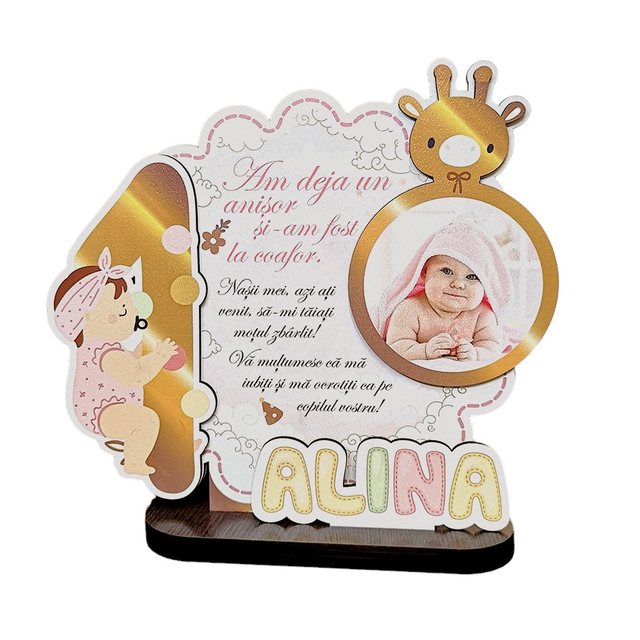 Trofeul personalizat cu dimensiuni de 19×21 cm este realizat din material de calitate, având un design elegant care evocă natura și puritatea. Acest cadou simbolic este cadoul ideal pentru nasi și mosi de botez, oferind un sentiment profund de recunoștință. Recenziile celor care l-au achiziționat subliniază aprecierea și emoția pe care acest trofeu le aduce în momentele speciale. Este perfect pentru a celebra o fetita care își taie motul, lichenii din designul său fiind o amintire a momentelor frumoase. Alege acest trofeu personalizat pentru a transforma fiecare ocazie într-un moment de neuitat.