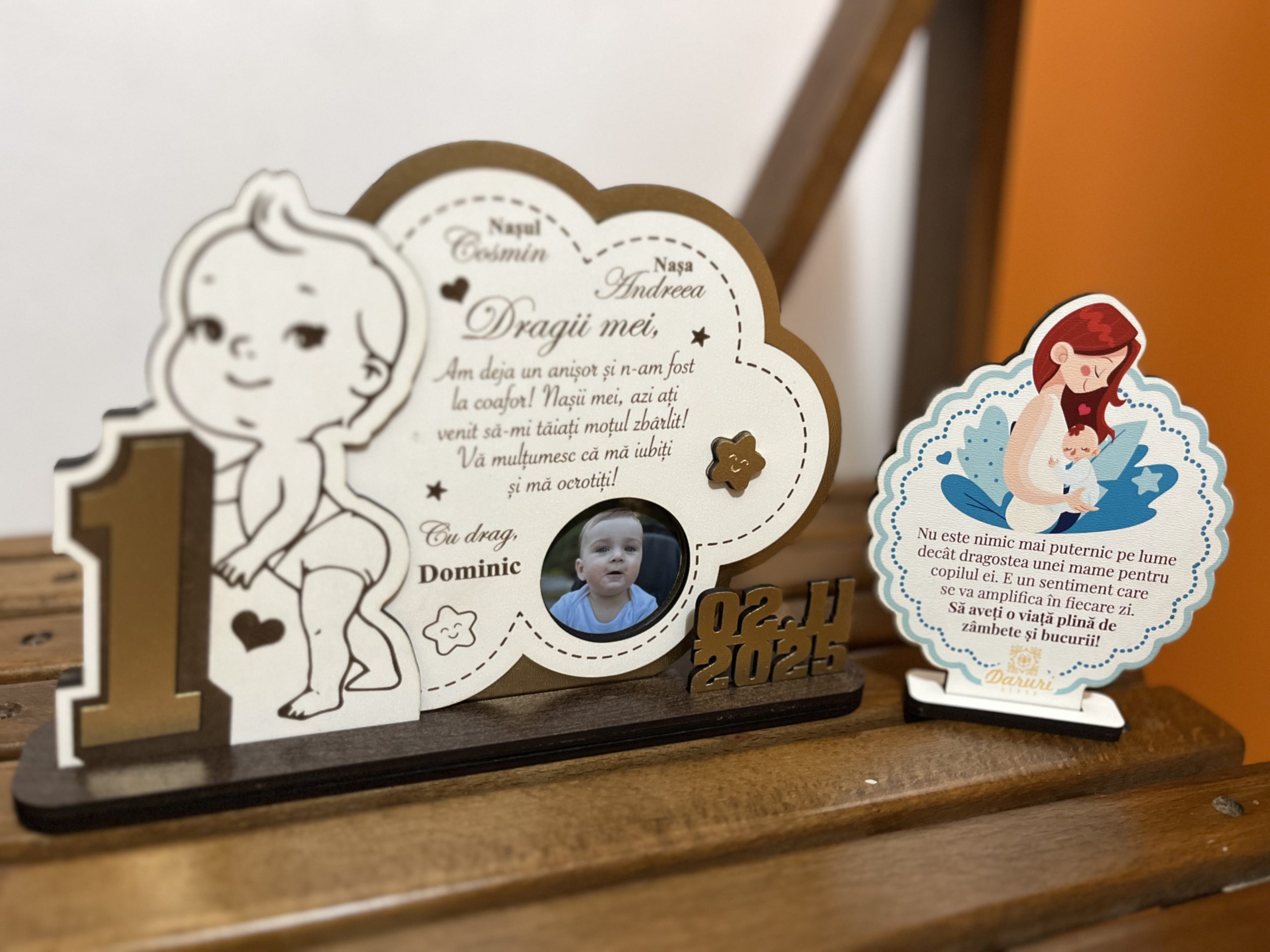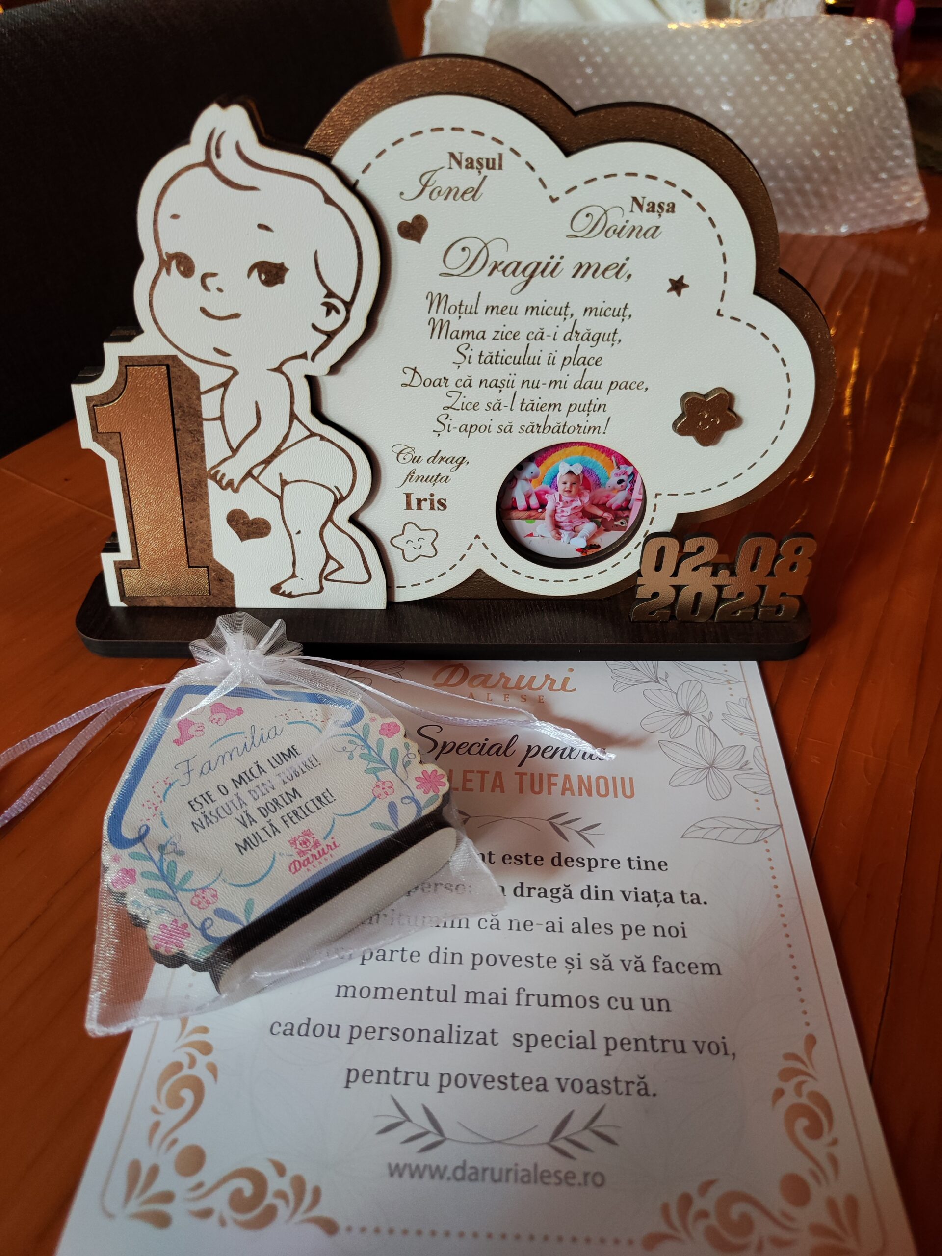 Este a doua lucrare cu acest site și rămân tot mai plăcut impresionată de profesionalismul oamenilor. Am avut nevoie de un cadou special pentru nașii copilașului meu și aici am găsit exact ce îmi doream! Calitatea produsului este excelentă! Am primit și un cadou amintire pentru mine. Vă mulțumesc din suflet, echipa Daruri Alese! Vă recomand cu drag! 💙