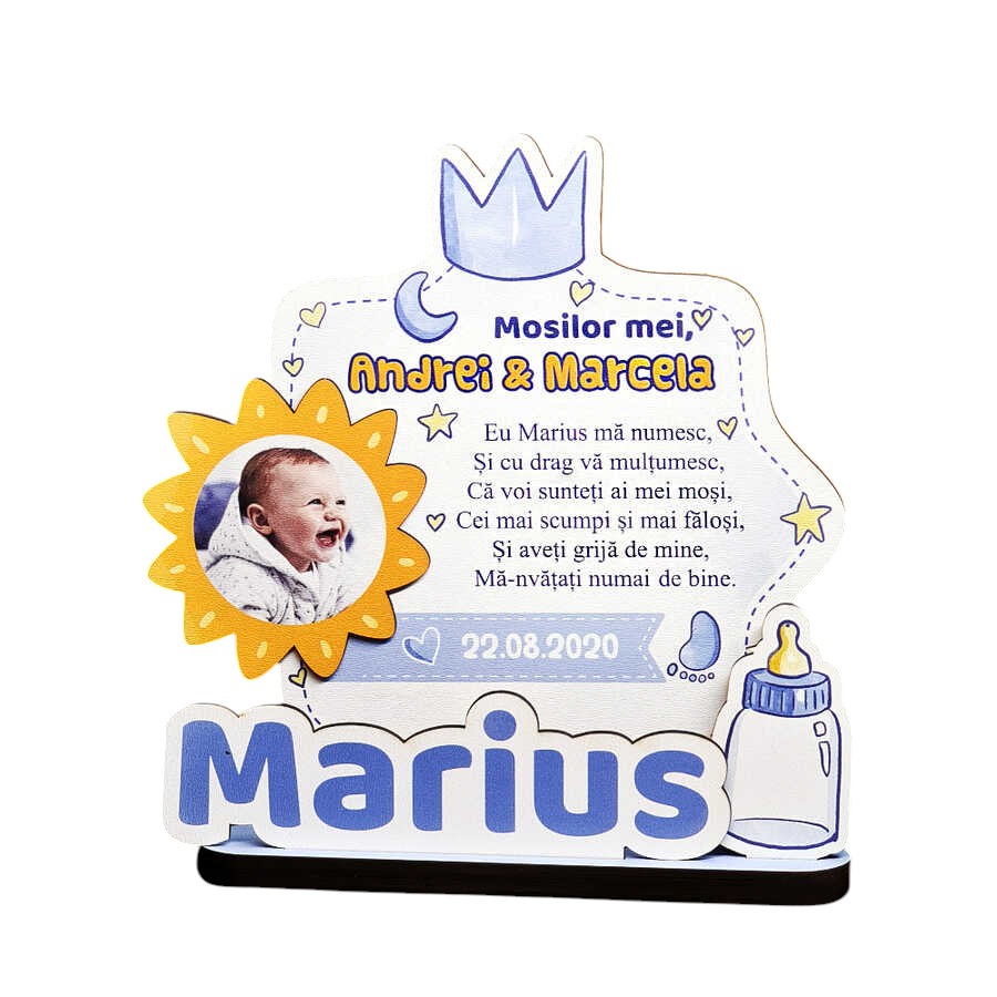 Designul trofeului este atât plin de culoare, cât și plin de semnificație, reprezentând bucuria și luminozitatea pe care finuțul le aduce în viața moșilor. Fotografia copilului, plasată central într-un cadru decorativ cu forma de floare, aduce un element personal și emoțional, transformând acest trofeu într-un cadou cu adevărat special și unic.