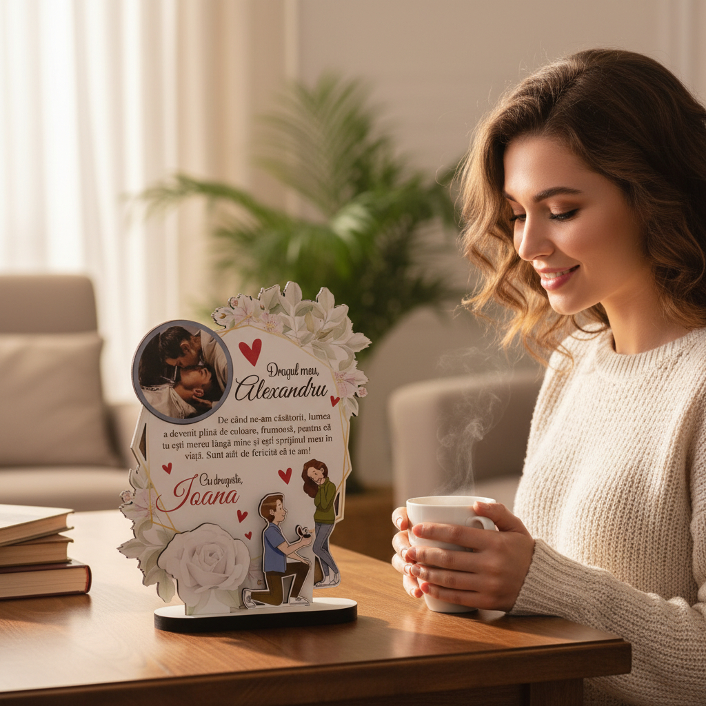 Un cadou simbolic pentru celebrarea iubirii, acest trofeu personalizat, cu dimensiuni de 24×19.5 cm, este realizat din materiale de calitate, perfect pentru a adăuga o notă specială oricărei ocazii. Ideea de a oferi un trofeu printat, ce reflectă sentimentele voastre, este o alegere inspirată, potrivită pentru aniversări, Ziua Îndrăgostiților sau alte momente speciale în relația voastră. Recenziile clienților mulțumiți evidențiază aprecierea pentru acest cadou original, devenit o amintire prețioasă. Împărtășește-ți dragostea printr-un gest care să rămână în sufletul celor dragi și care să aducă zâmbete pe chipurile lor.