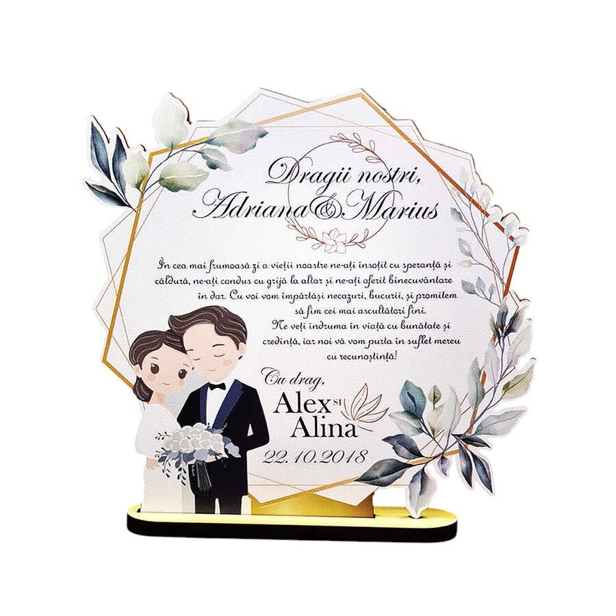 Acest trofeu elegant, cu dimensiuni de 19.5x20cm, este realizat din materiale premium, oferind un aspect rafinat și o durabilitate crescută. Designul său unic și personalizat va evoca amintiri plăcute, venind în întâmpinarea nevoii de a recompensa pe cei care au fost alături de voi în această zi importantă. Review-urile excelente primite de la alte cupluri care au optat pentru acest cadou confirmă aprecierea și emoția pe care o aduce. Lichenii care decorează trofeul sunt o repetiție a naturii și purității, făcând din acesta un cadou perfect pentru nasi.