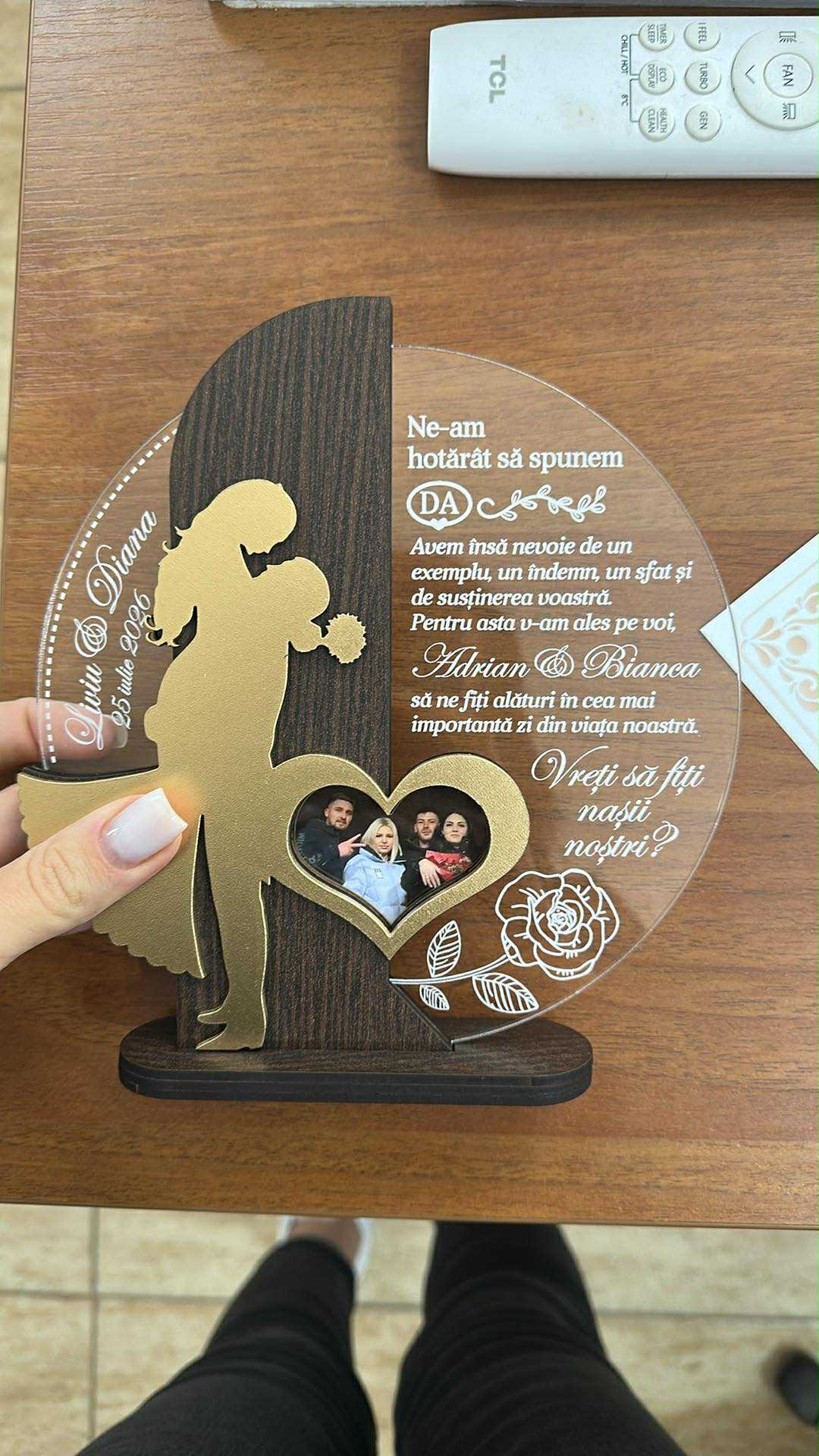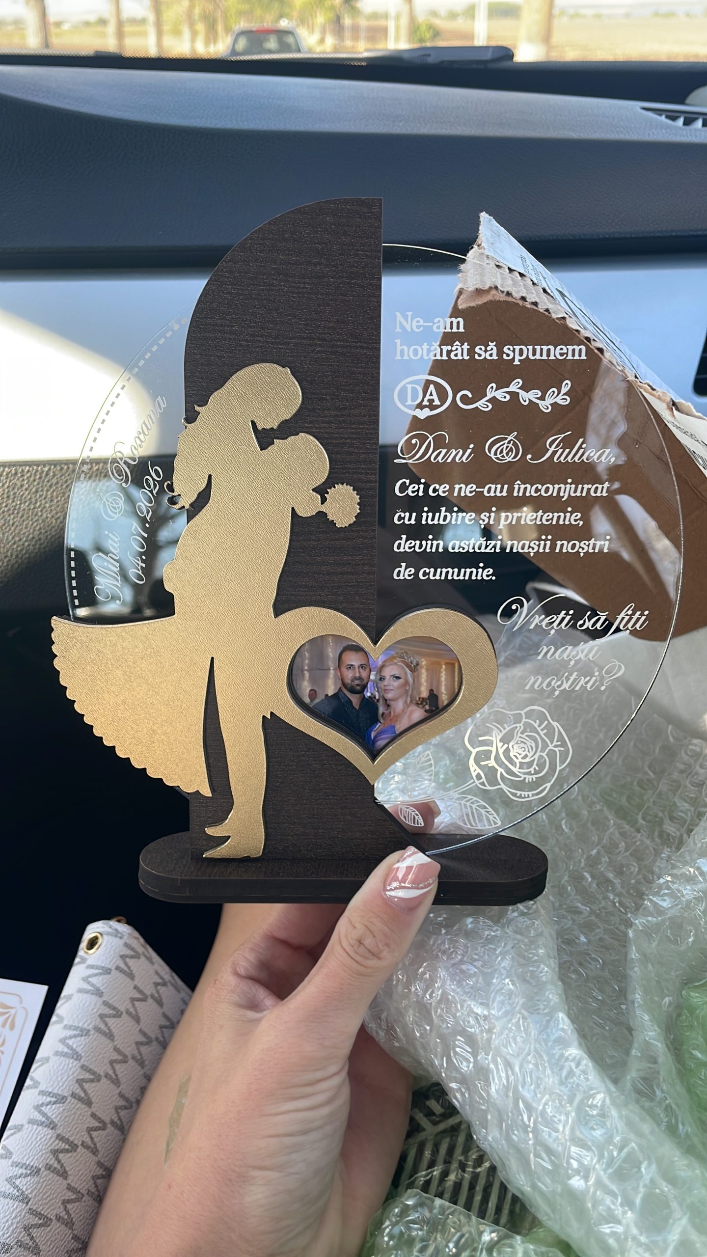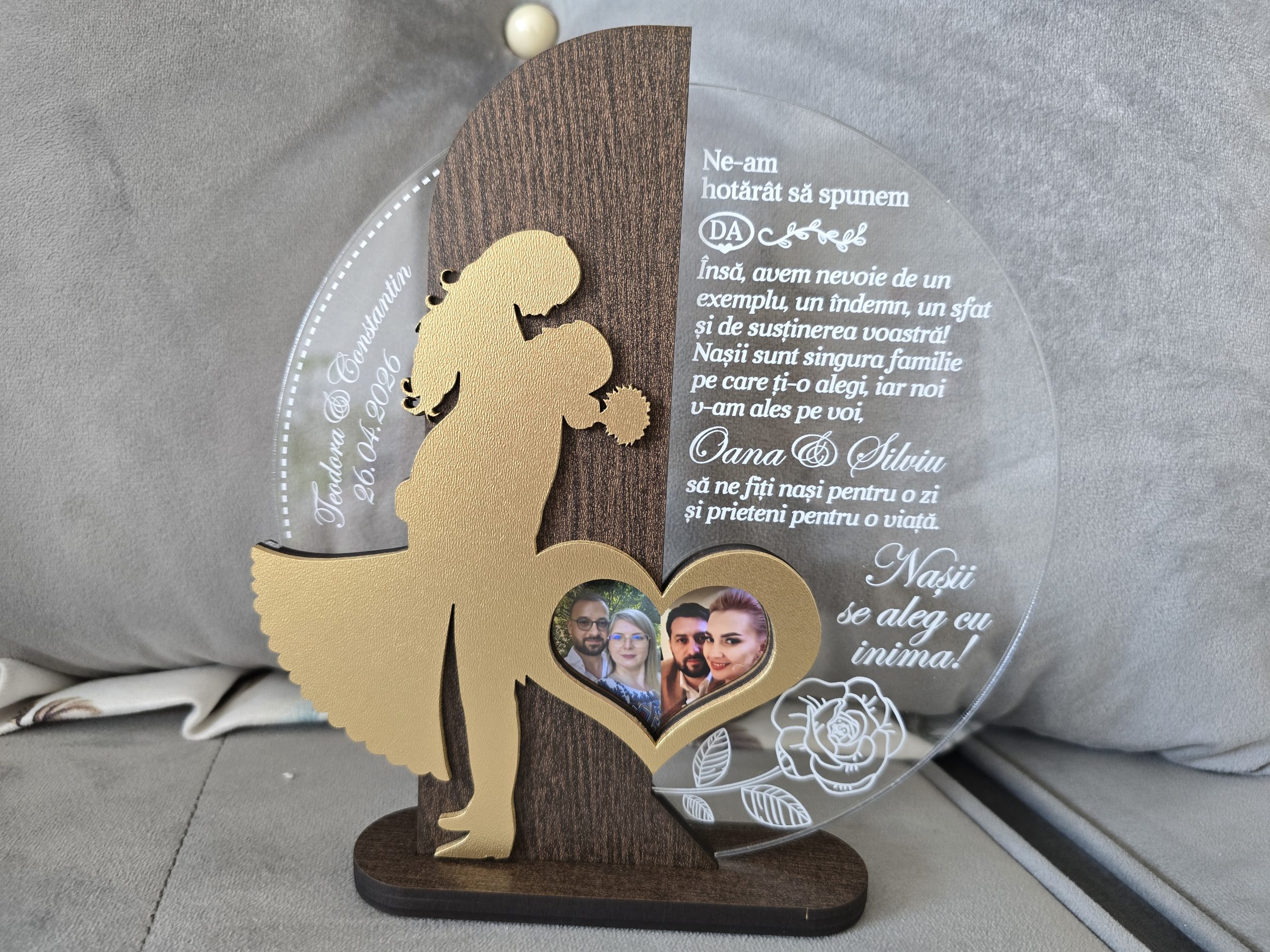 Si pentru ca stim ca o poza face cat o mie de cuvinte, iti oferim posibilitatea de a personaliza placheta cu o fotografie, fie ca este cu voi doi, cu nasii sau toti patru! Puteti pune o poza dintr-o vacanta in care v-ati distrat foarte bine impreuna, o poza reusita cu voi doi, sau una indragita foarte tare de nasii vostri! Orice decizie veti lua, cu siguranta va fi un cadou ce le va aduce zambetul pe buze ori de cate ori il vor vedea!